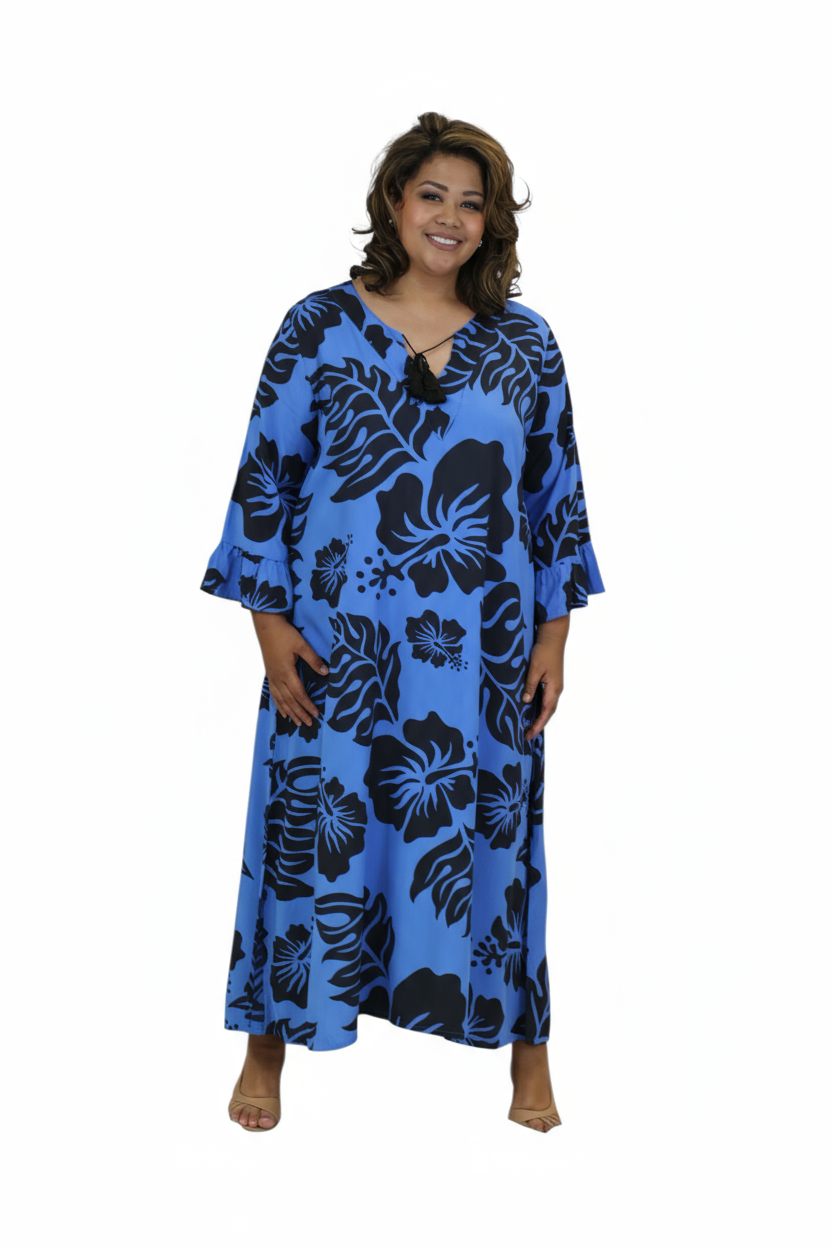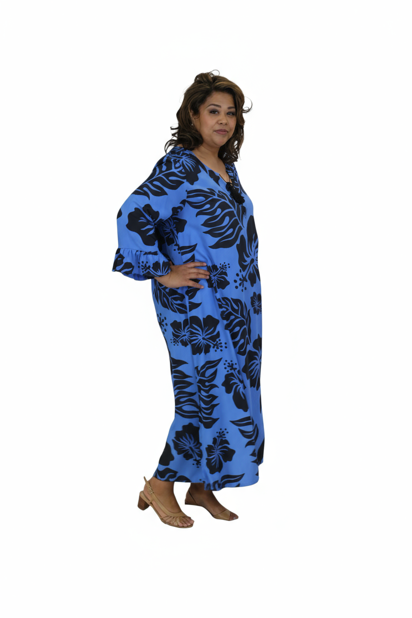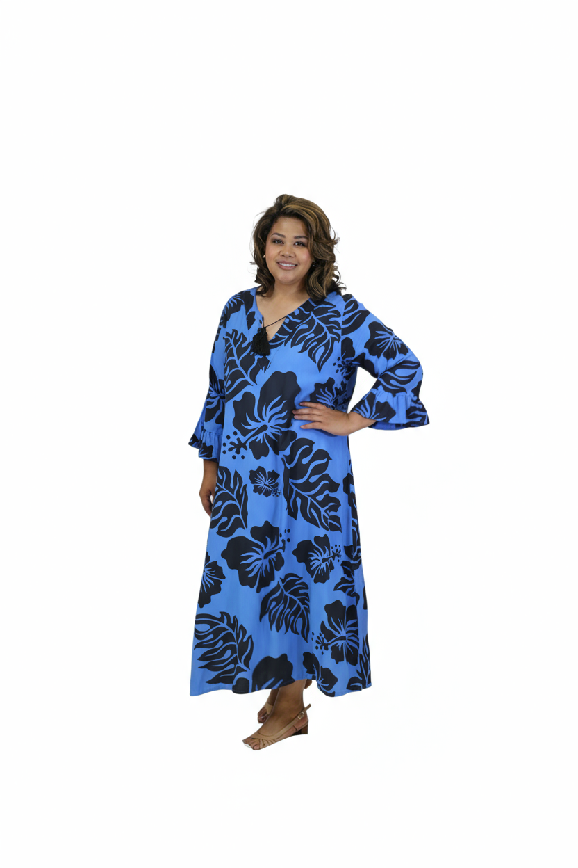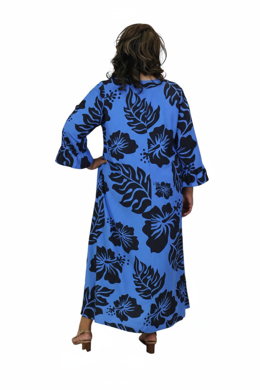 Embrace effortless island elegance in this beautiful blue and black hibiscus print long dress. Made from soft, breathable rayon, it flows gracefully for a flattering silhouette that moves with you.