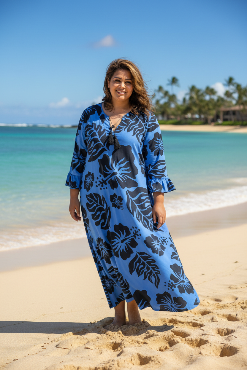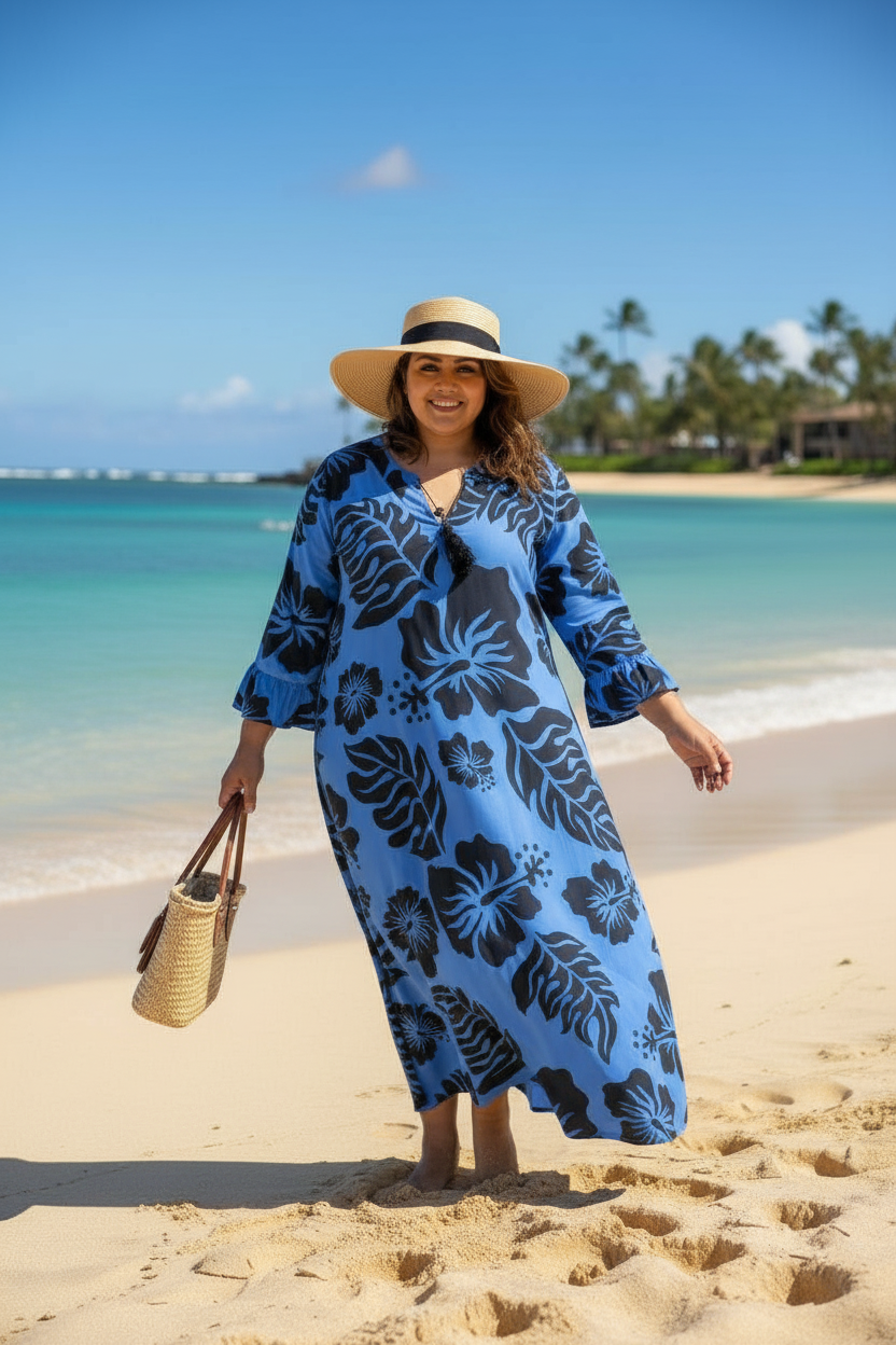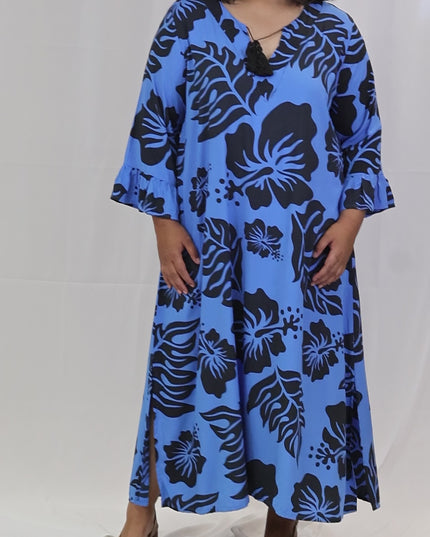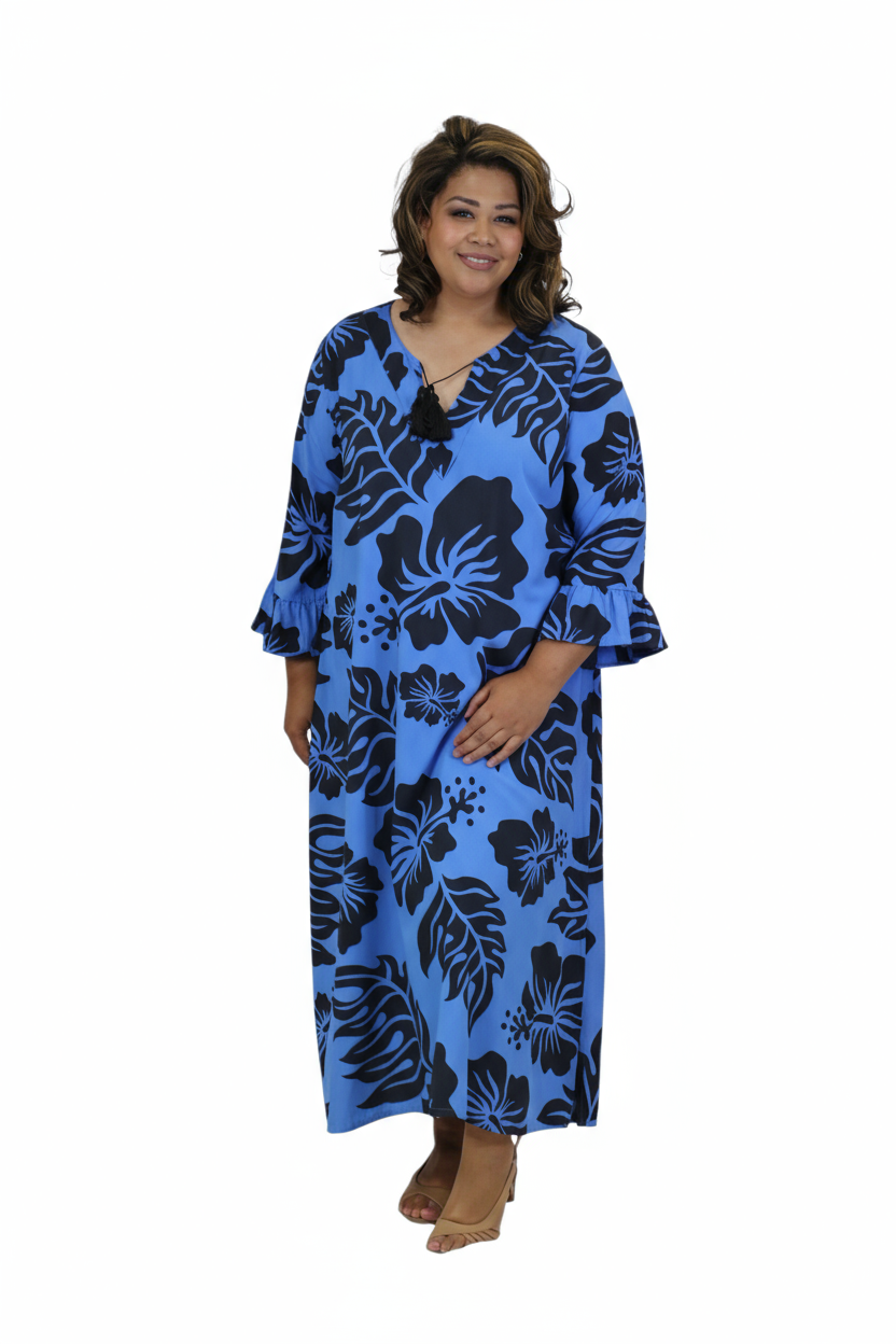 Embrace effortless island elegance in this beautiful blue and black hibiscus print long dress. Made from soft, breathable rayon, it flows gracefully for a flattering silhouette that moves with you.