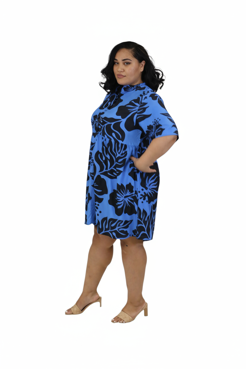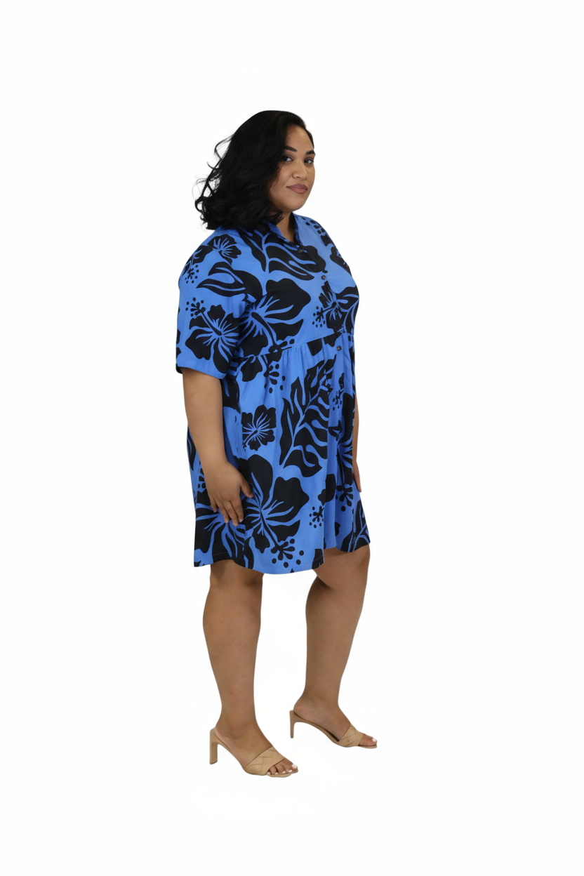 Bring tropical elegance to your everyday style with this stunning blue rayon midi dress. Designed with a bold black hibiscus print, it offers a relaxed yet flattering fit for perfect for any occasion.