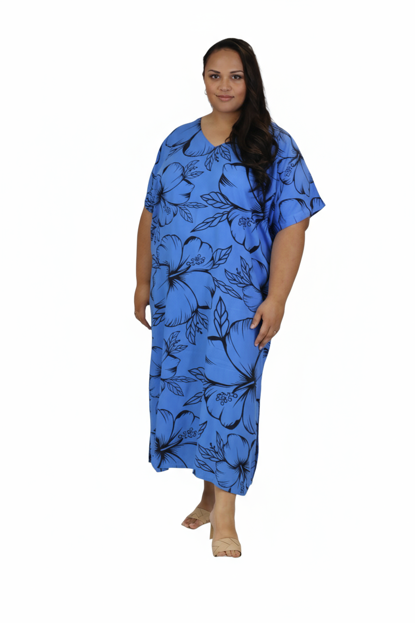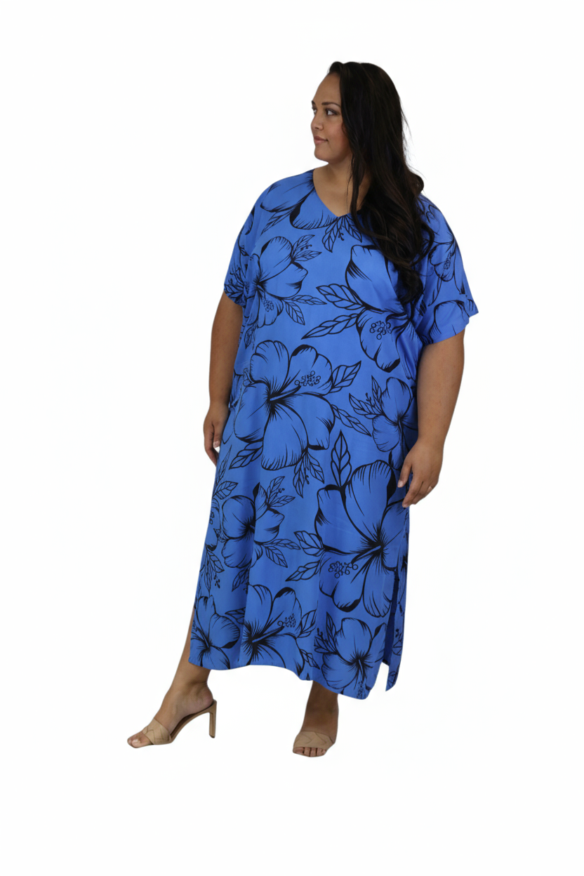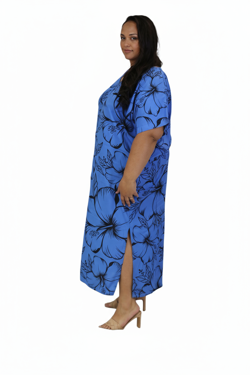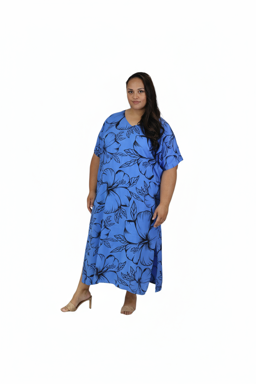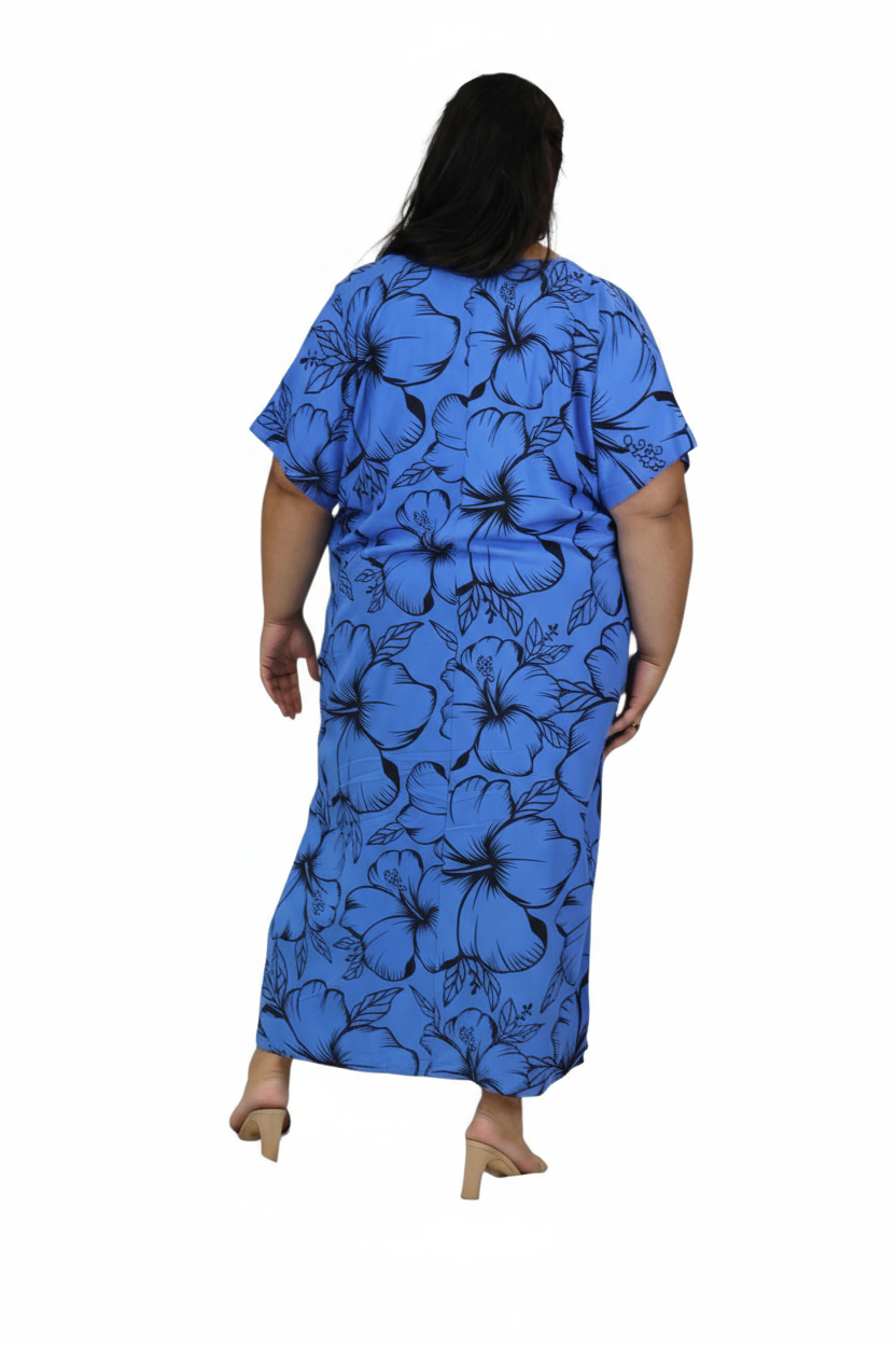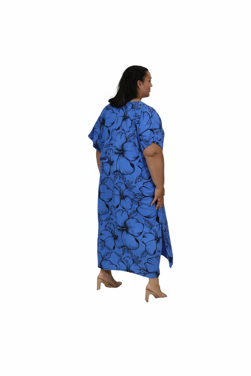 A blend of island elegance and everyday comfort. This vibrant blue kaftan dress features a bold hibiscus print and a relaxed silhouette that flatters effortlessly. Made with soft, breathable rayon, it drapes beautifully for all-day ease.