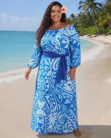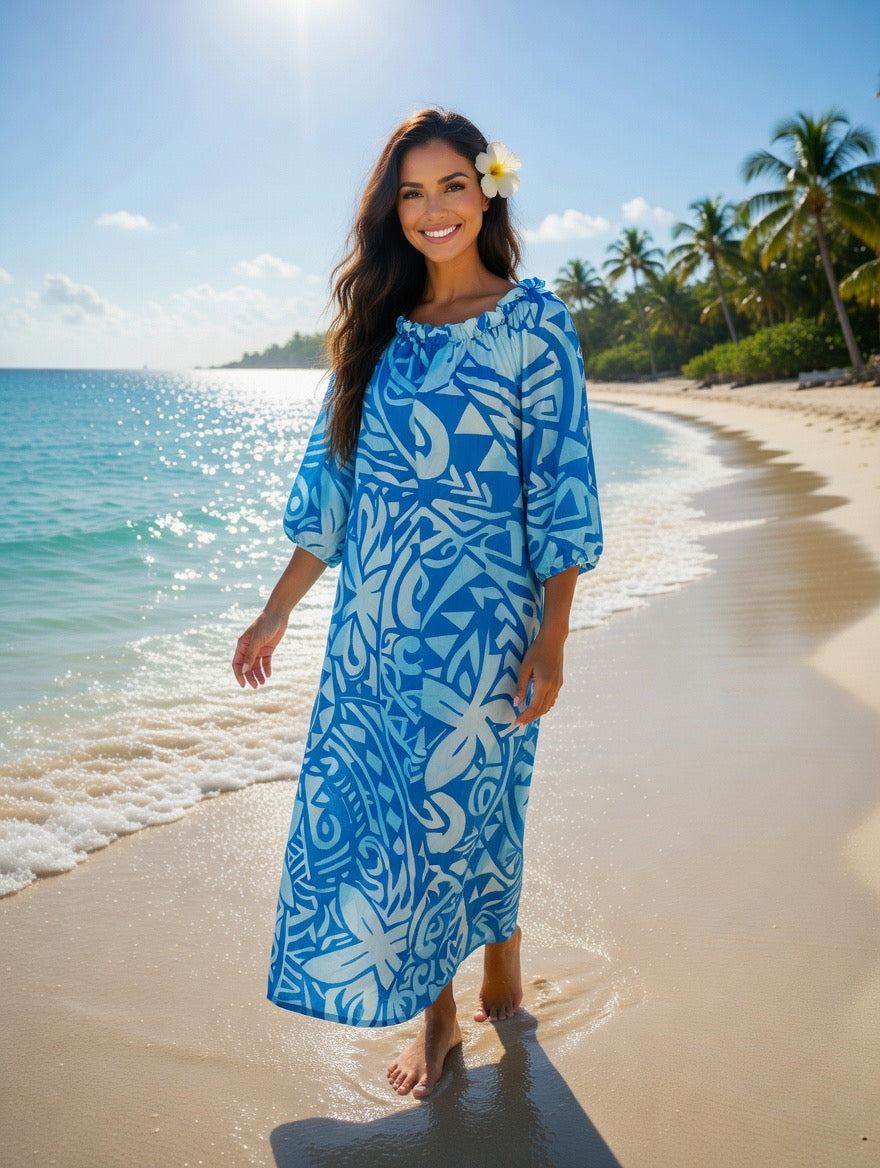 Step into island-inspired elegance with our blue tribal print chiffon maxi dress, designed for comfort, confidence, and timeless style. Featuring a bold Polynesian-inspired print in vibrant blue and white, this dress brings a fresh tropical vibe perfect for beach days, vacations, and summer gatherings.