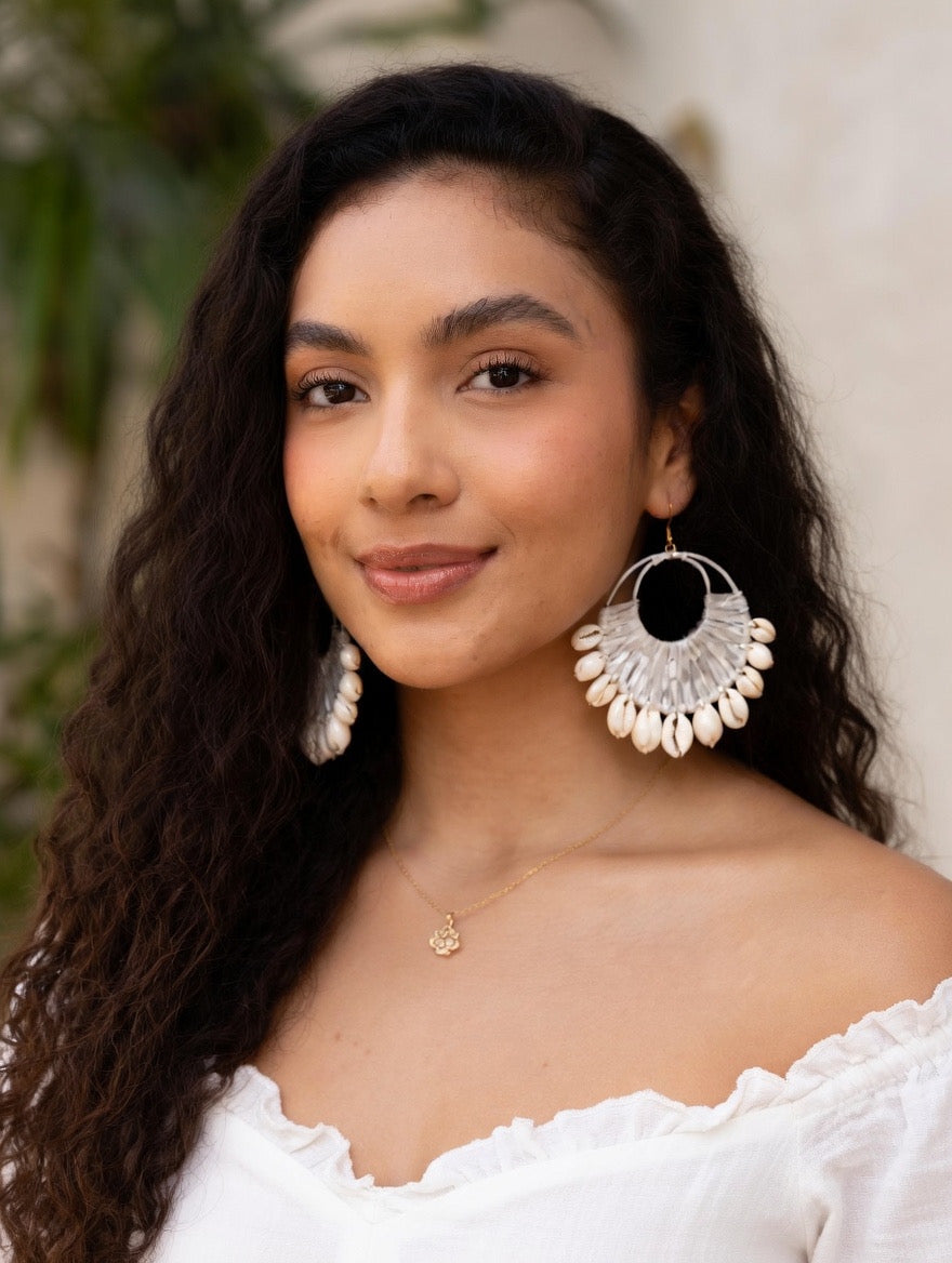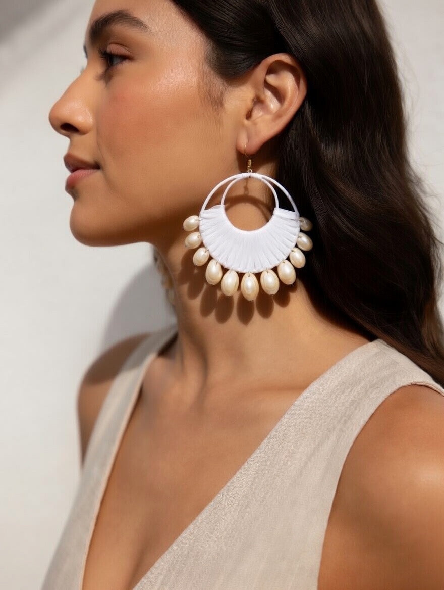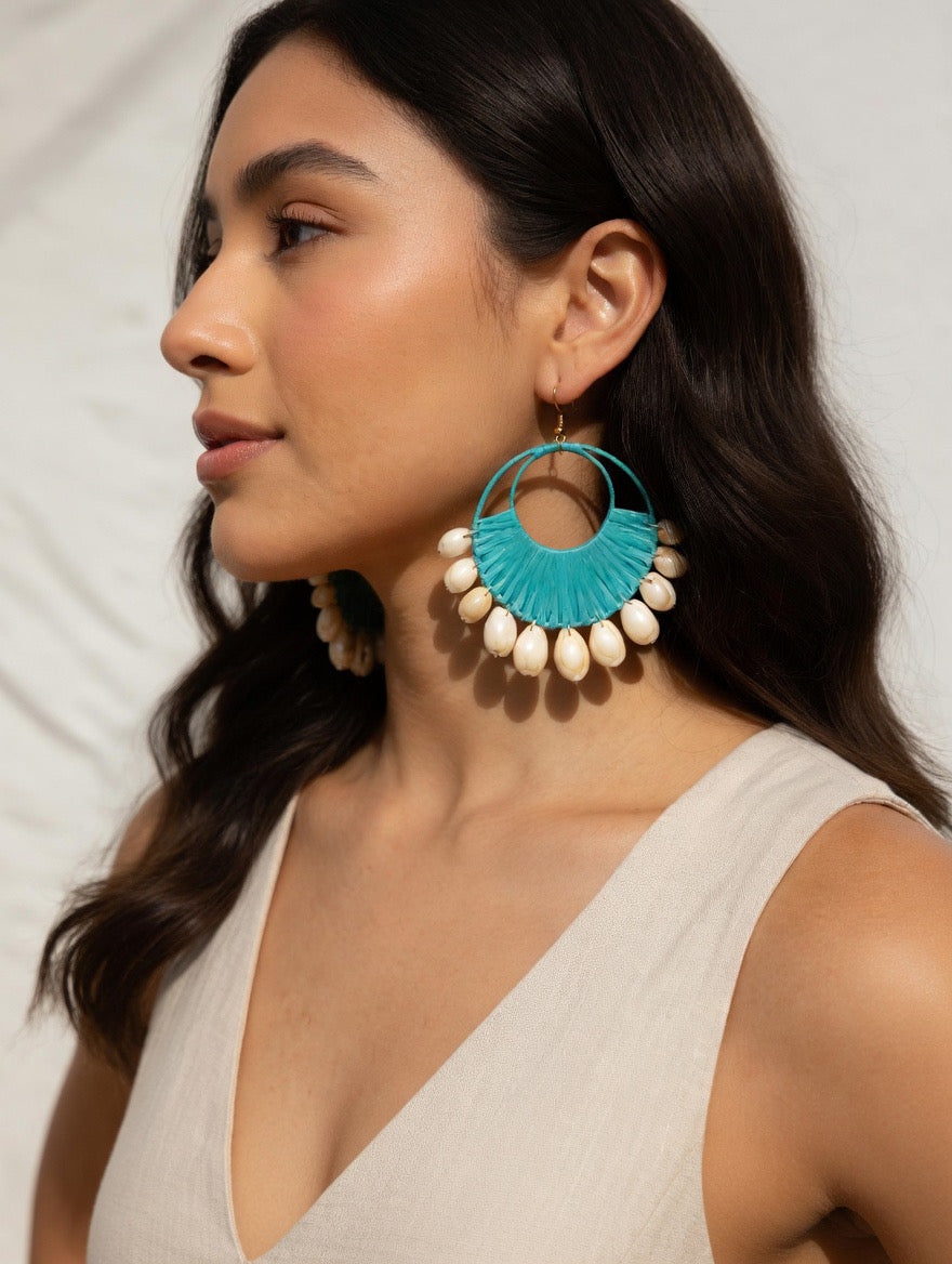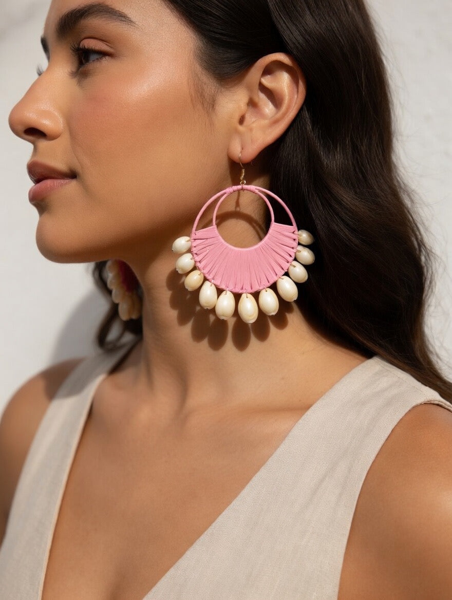 Each pair is handcrafted with a fan-shaped woven design and finished with glossy shell beads that sway beautifully with movement - perfect for adding a touch of beachy sophistication to your look.
