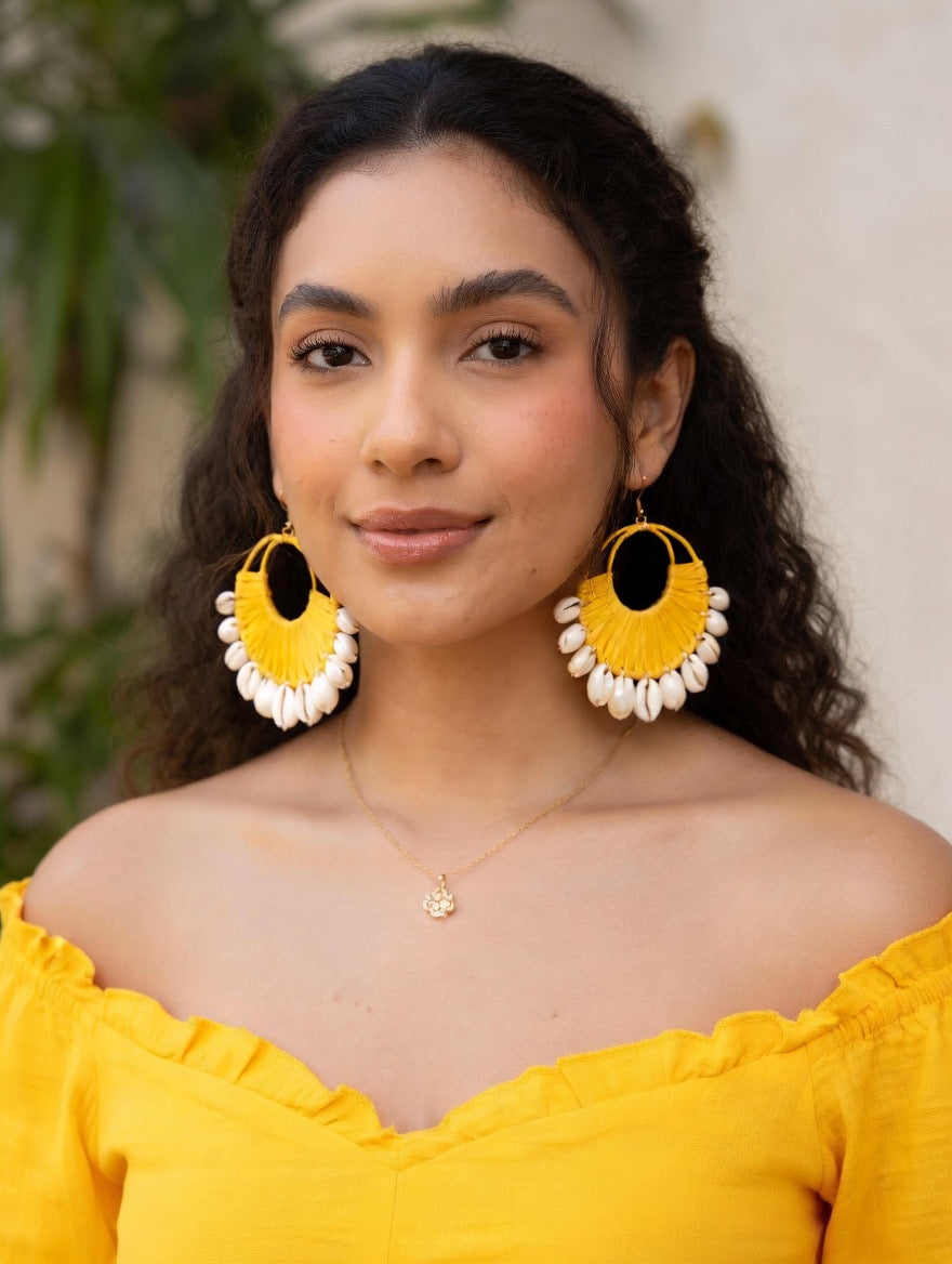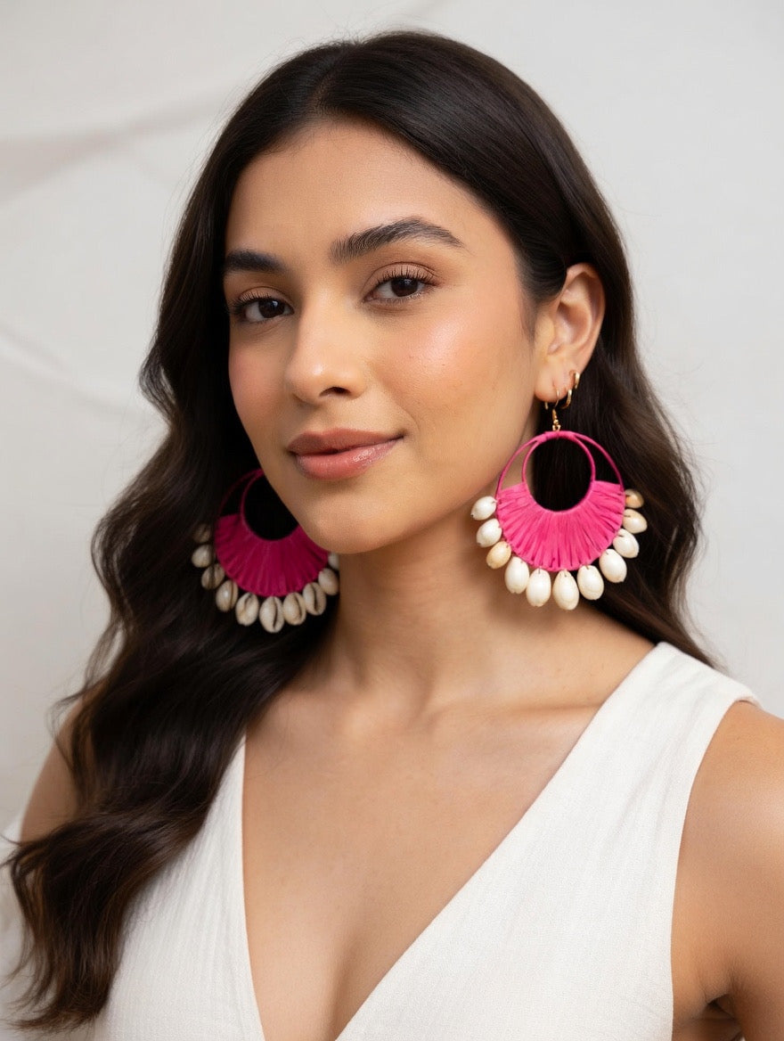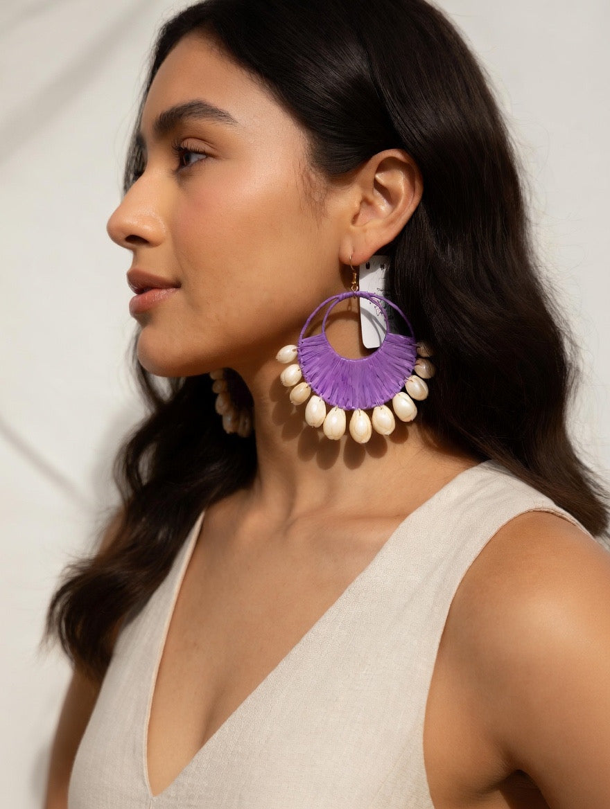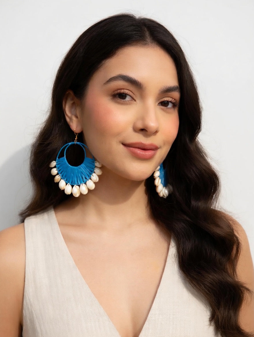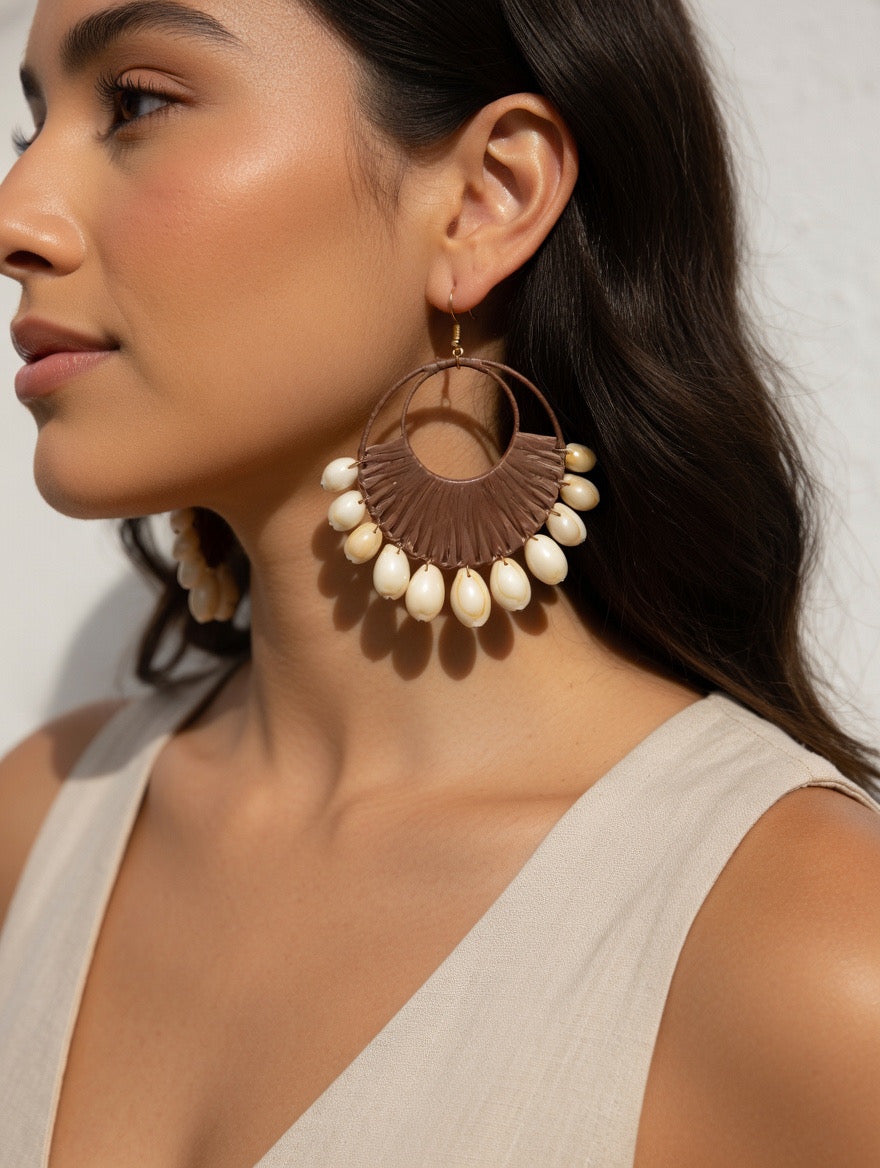 Each pair is handcrafted with a fan-shaped woven design and finished with glossy shell beads that sway beautifully with movement - perfect for adding a touch of beachy sophistication to your look.