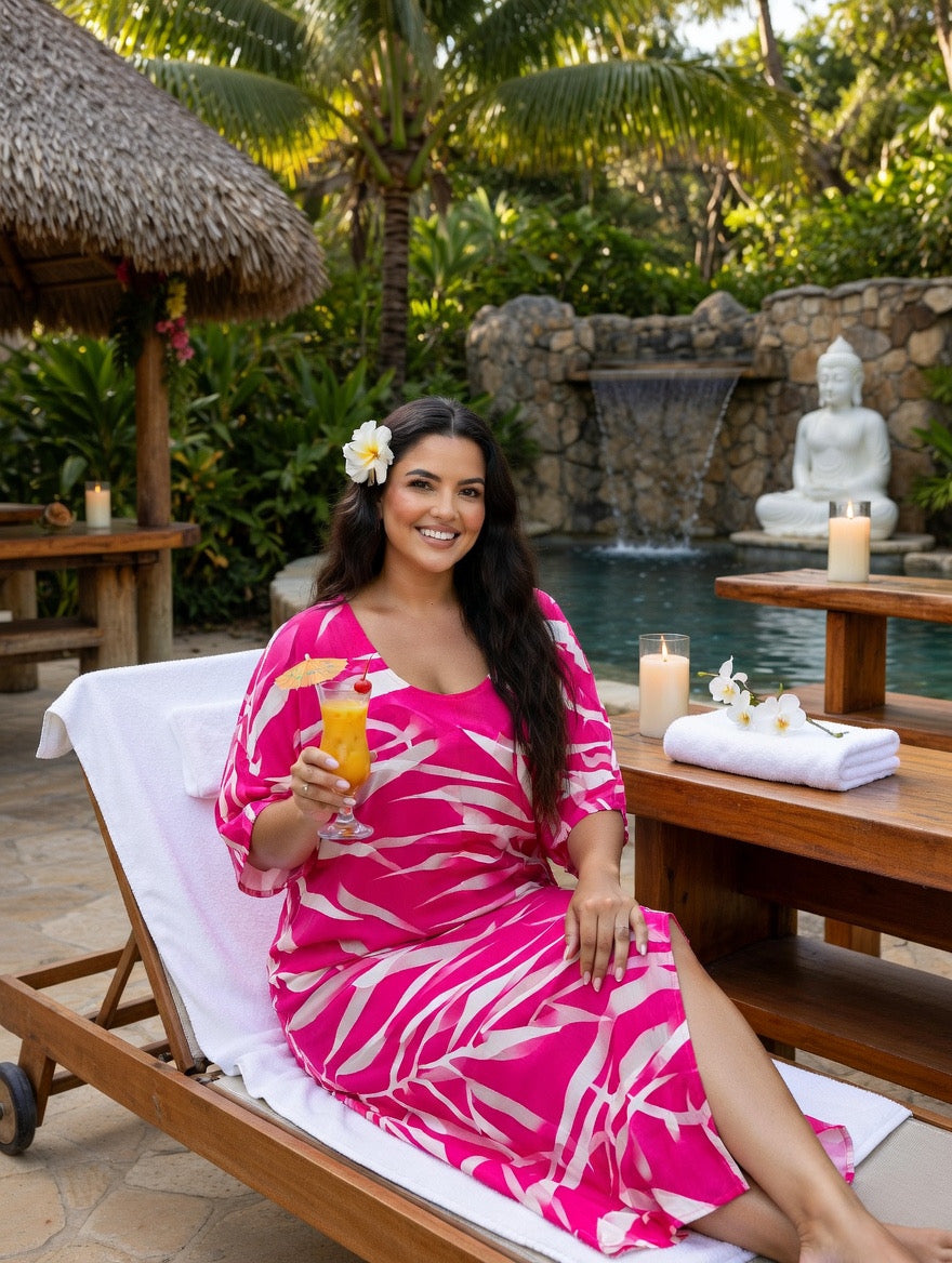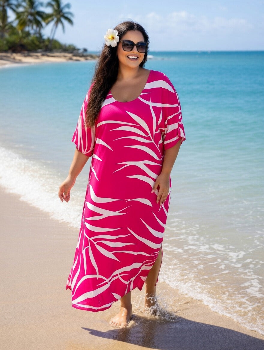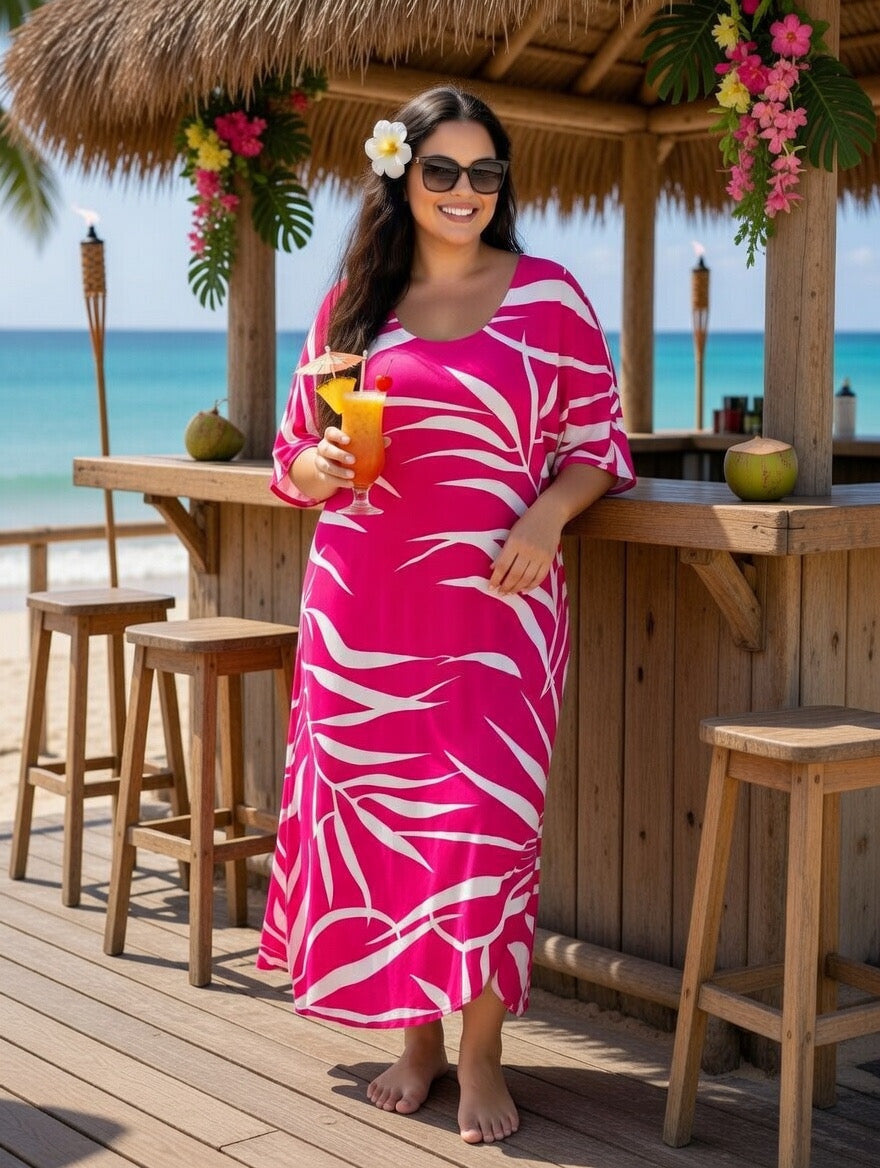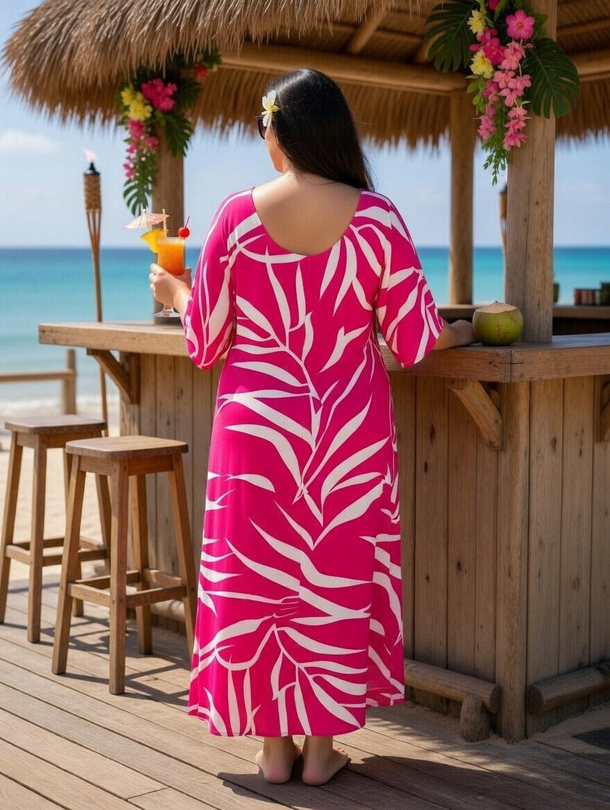 Bring vibrant island style to your wardrobe with this beautiful pink tropical fern rayon maxi dress, designed for comfort, elegance, and effortless summer fashion. Made from soft, breathable rayon fabric, this dress feels light and airy, making it the perfect choice for warm weather, beach vacations, and tropical getaways.