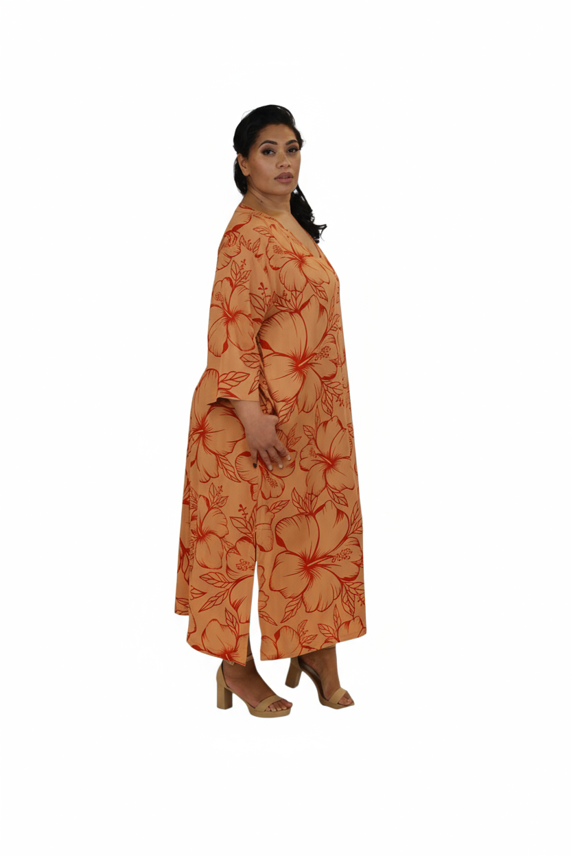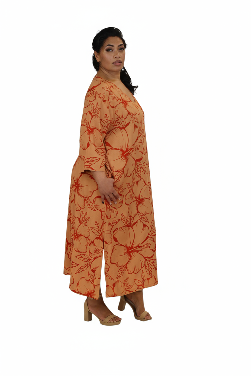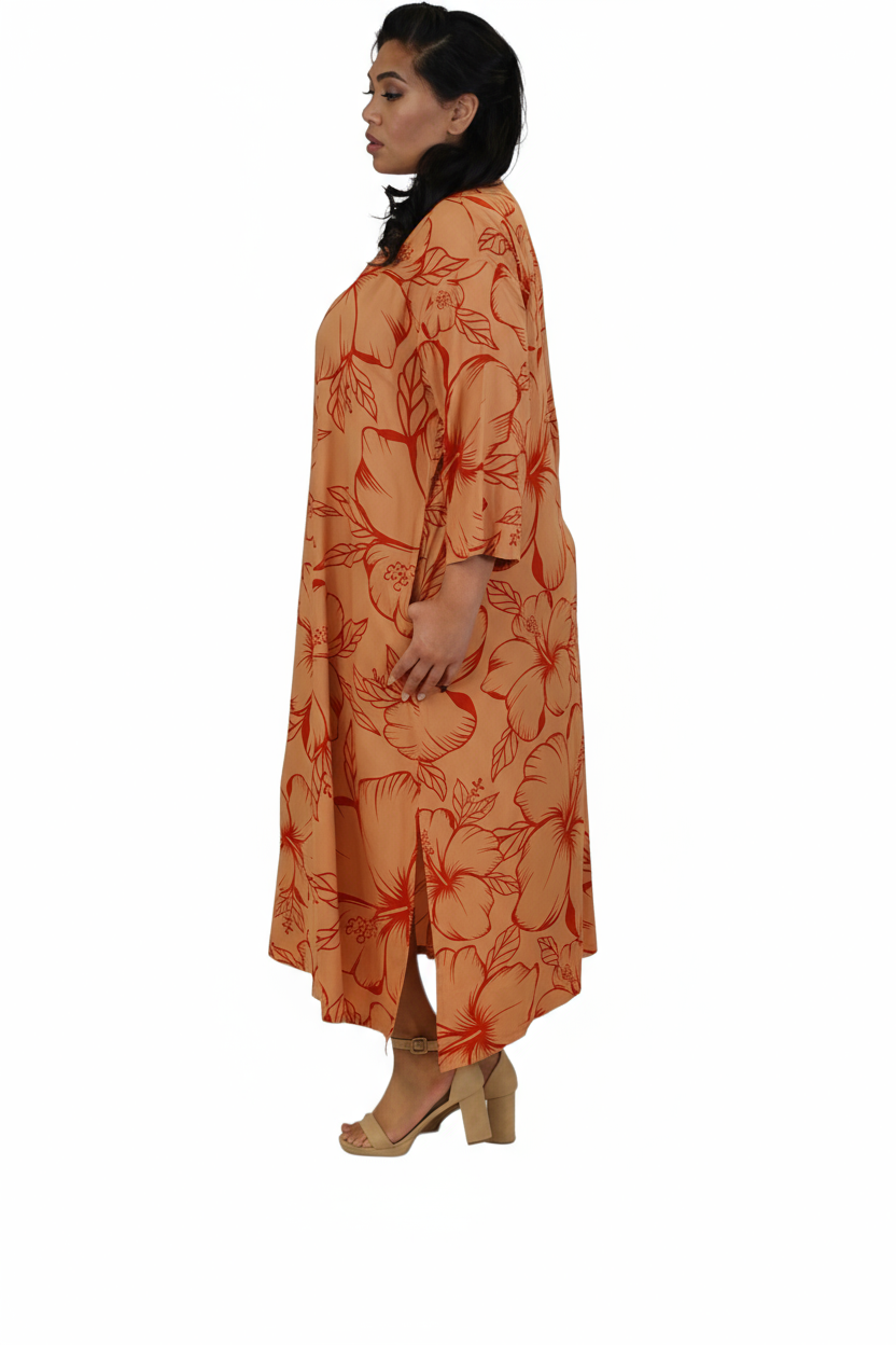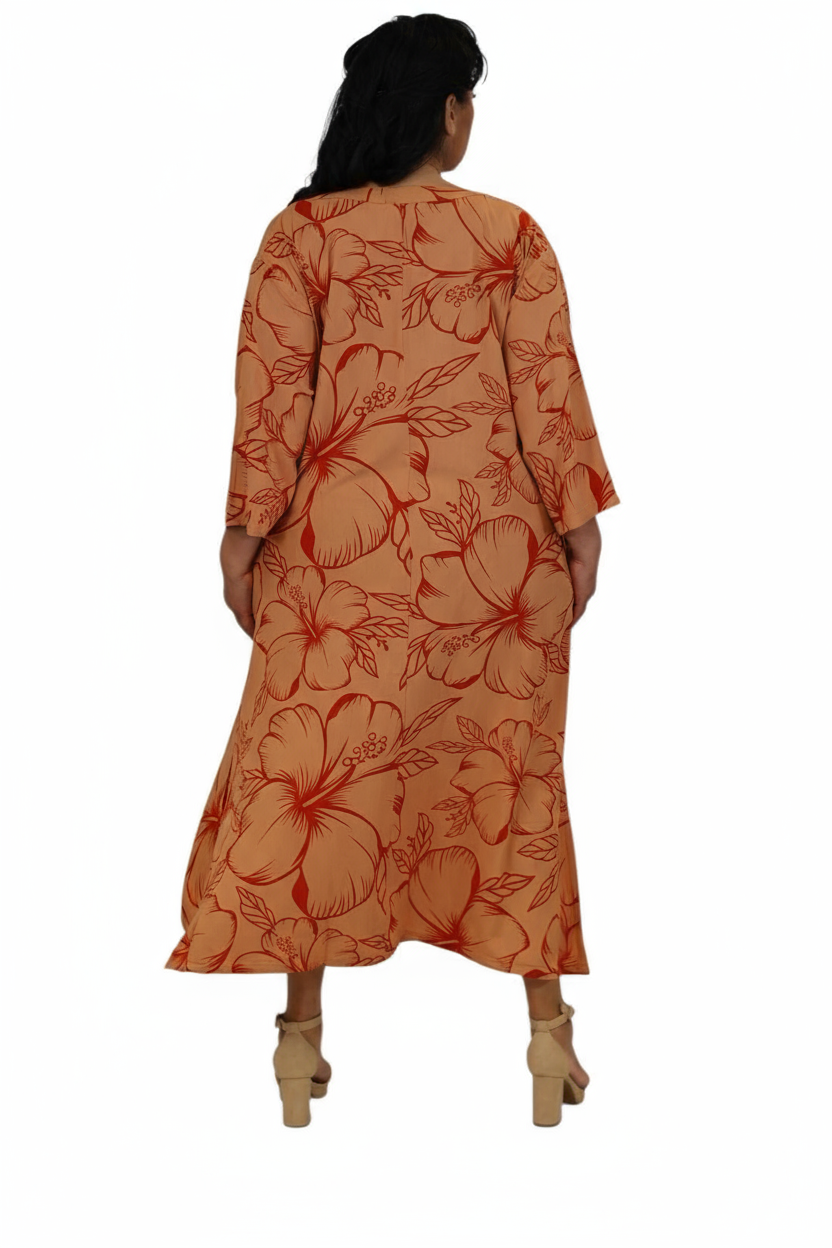 Bring island elegance to every moment with this beautifully flowing maxi dress. Made from soft and breathable rayon, it features a bold orange and red hibiscus print that celebrates Pacific style. The relaxed silhouette drapes effortlessly, while the V-neckline and 3/4 length sleeves add a flattering feminine touch. Complete with convenient side pockets for everyday wear.