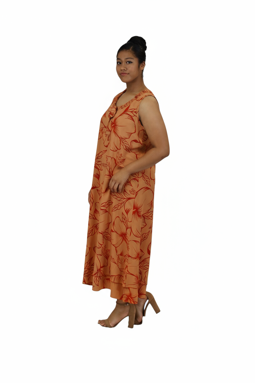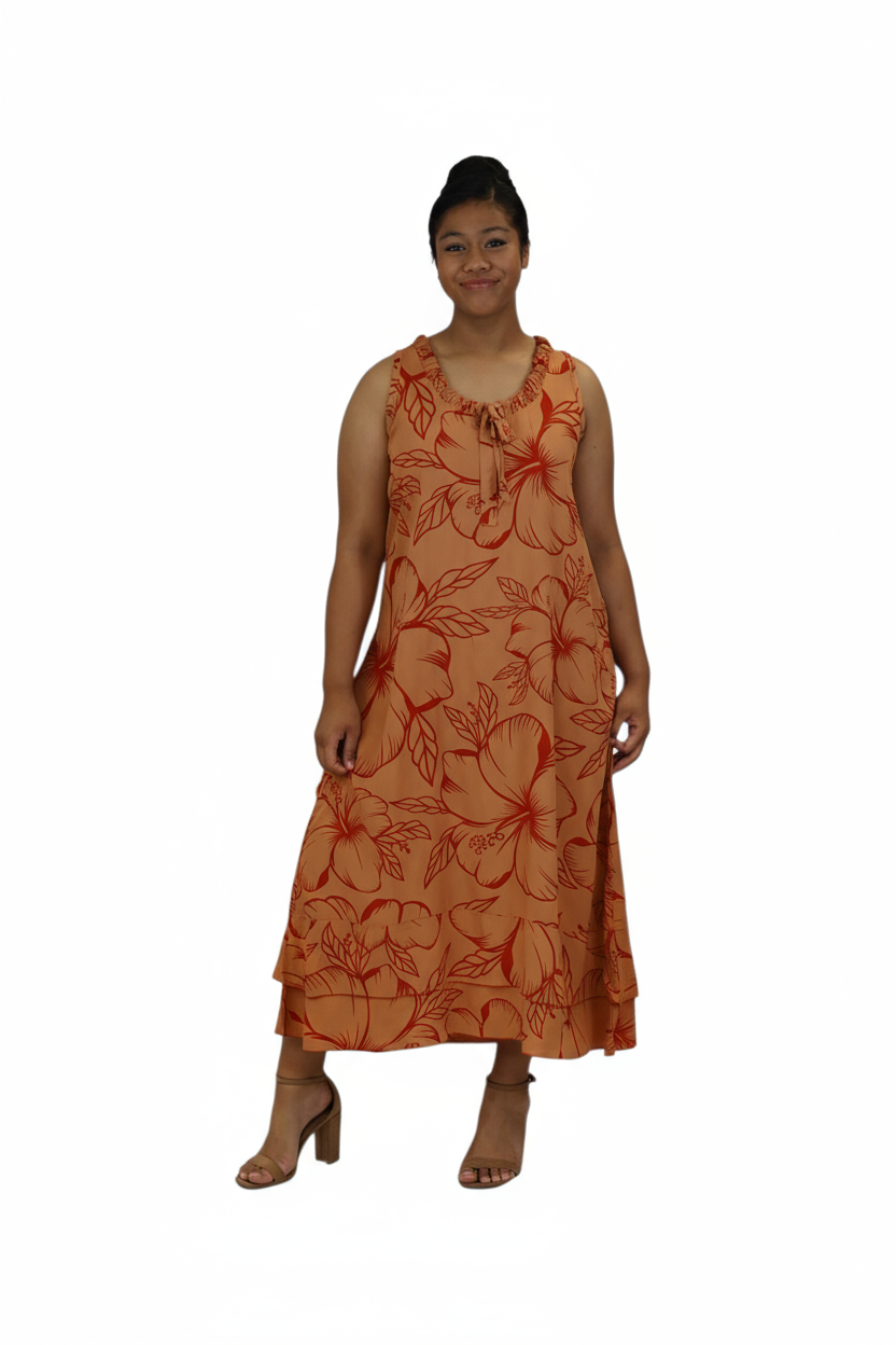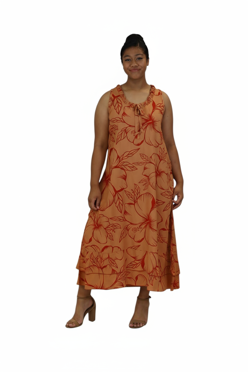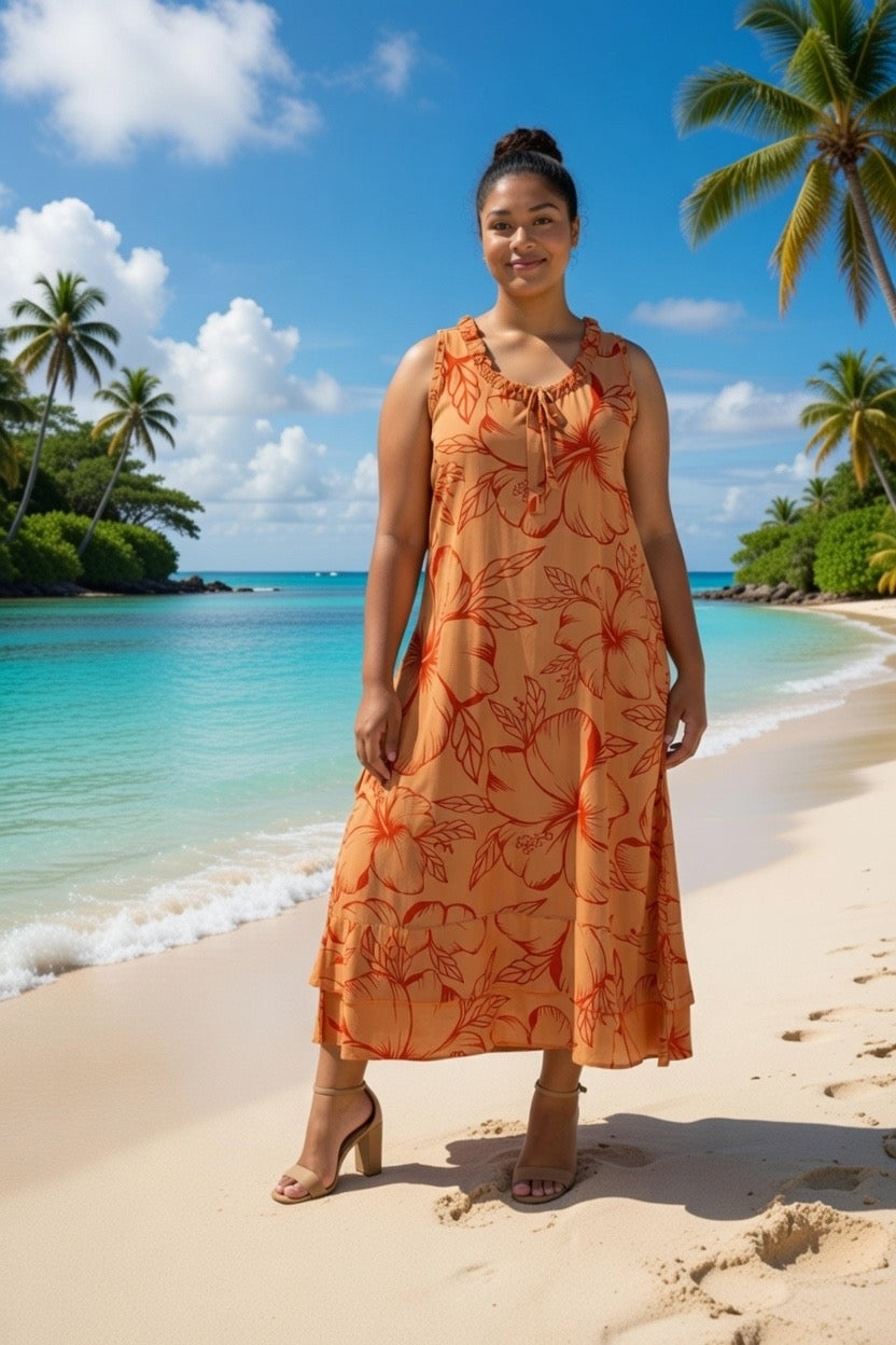 The adjustable tie neckline gives you a flexible fit and adds a playful detail, while the orange base with bold red hibiscus print celebrates Pacific floral heritage. The short sleeves and maxi -length silhouette make it an easy go-to for vacations, brunch dates and everyday chic.