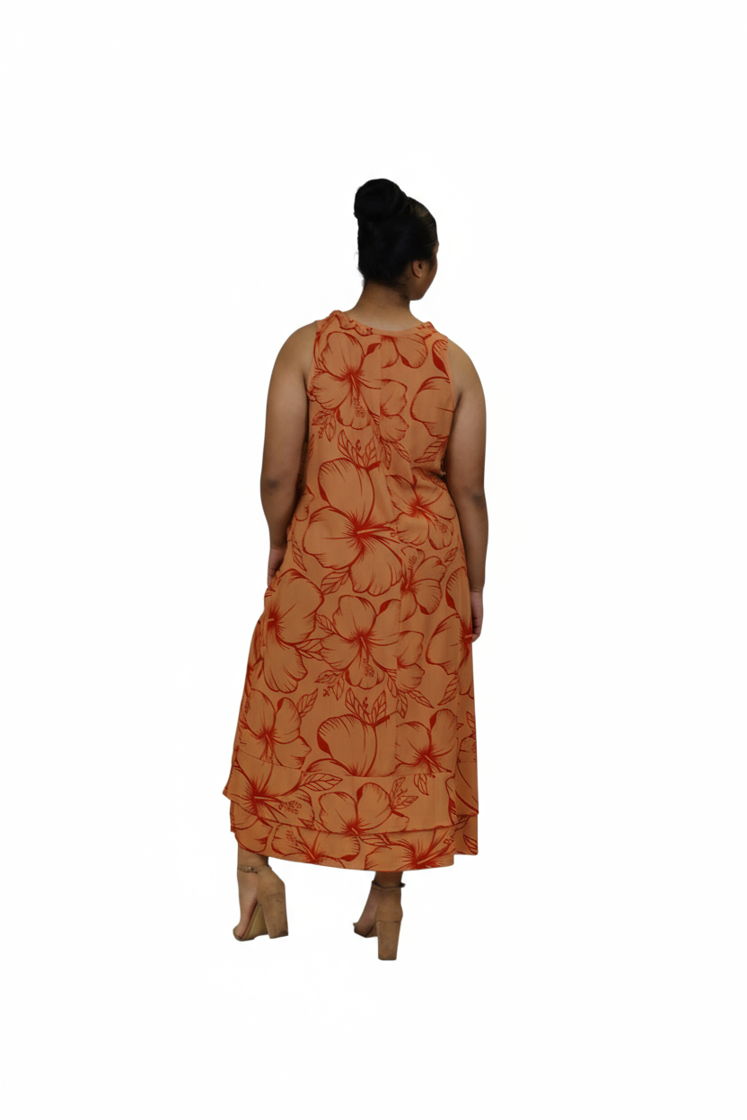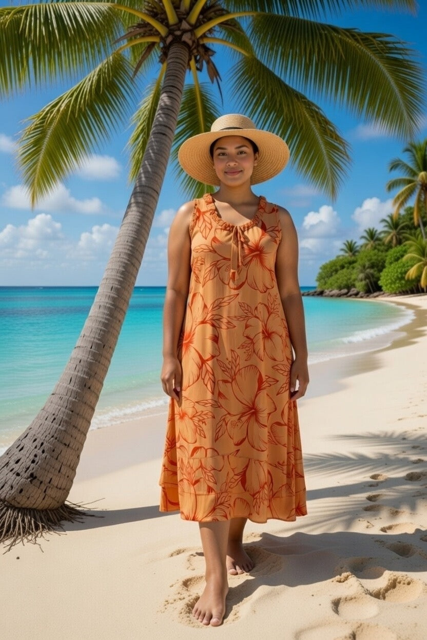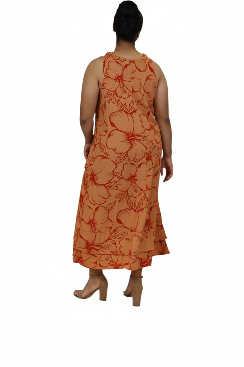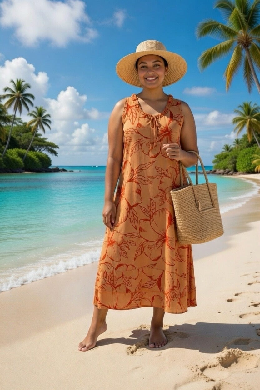 The adjustable tie neckline gives you a flexible fit and adds a playful detail, while the orange base with bold red hibiscus print celebrates Pacific floral heritage. The short sleeves and maxi -length silhouette make it an easy go-to for vacations, brunch dates and everyday chic.