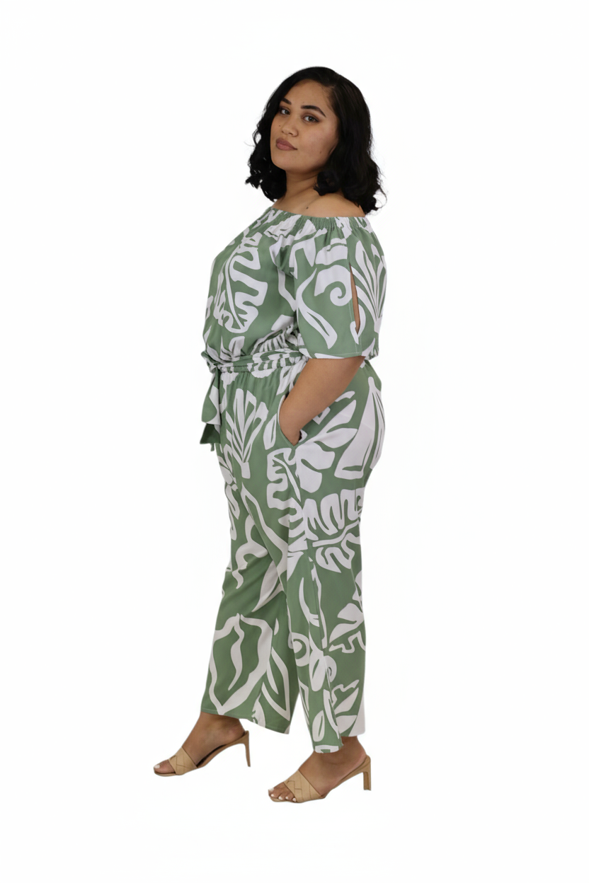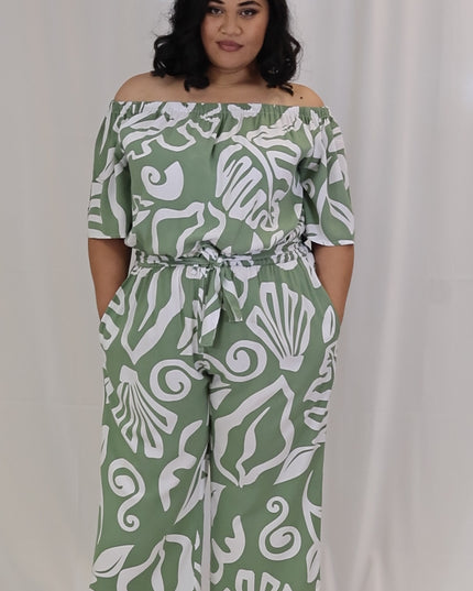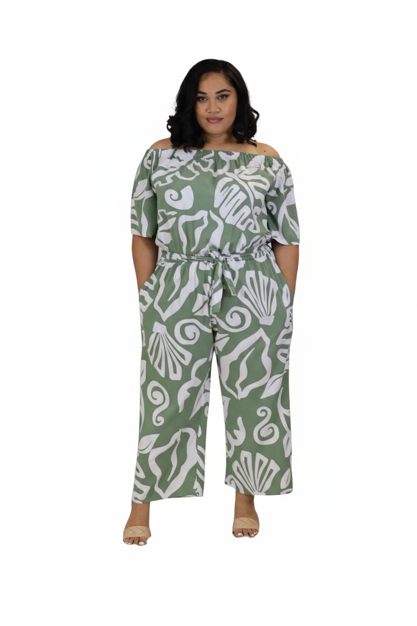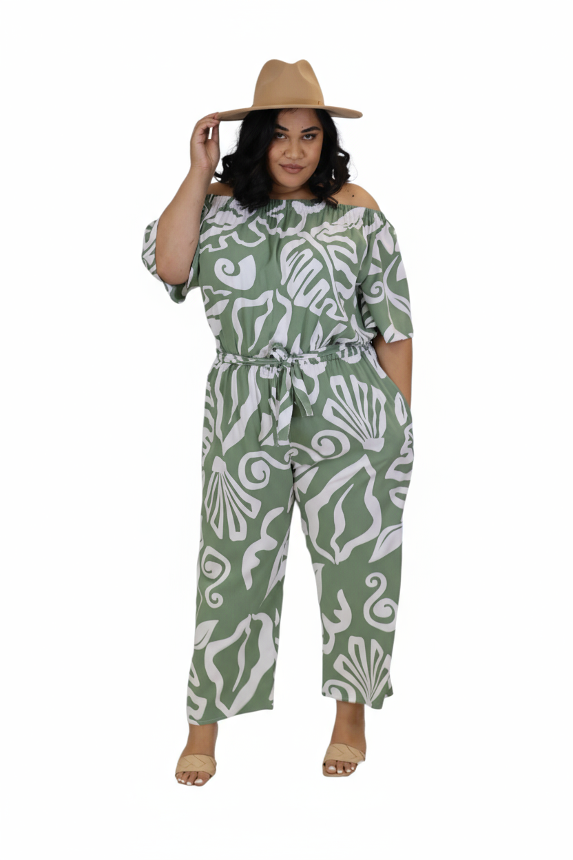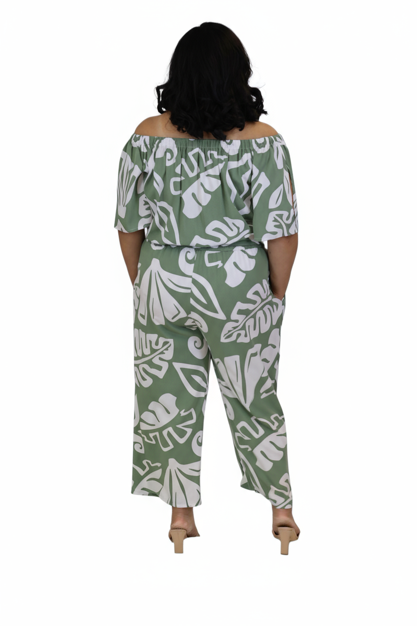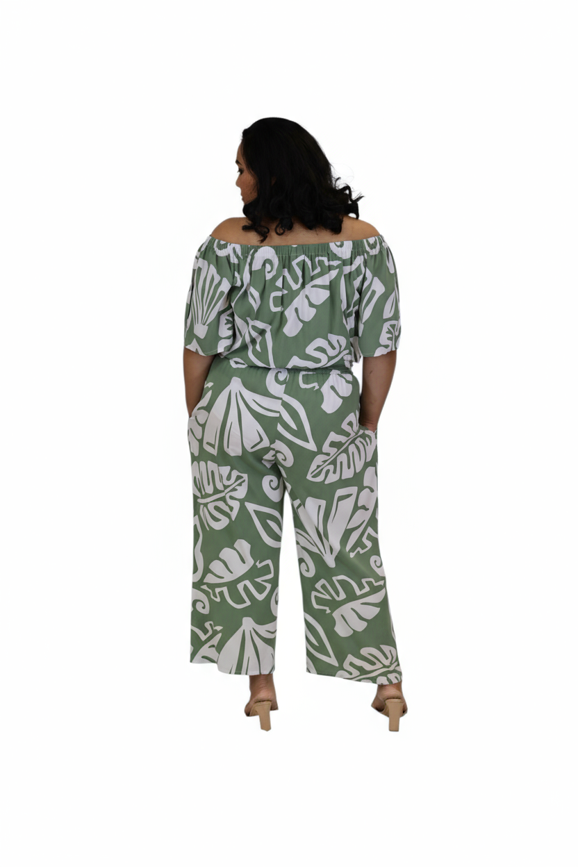 Effortless chic and island-inspired, this lightweight rayon jumpsuit is perfect for sunny days and tropical getaways. Featuring a bold olive print, its designed with an elastic neckline that can be worn on or off the shoulder for versatile styling.