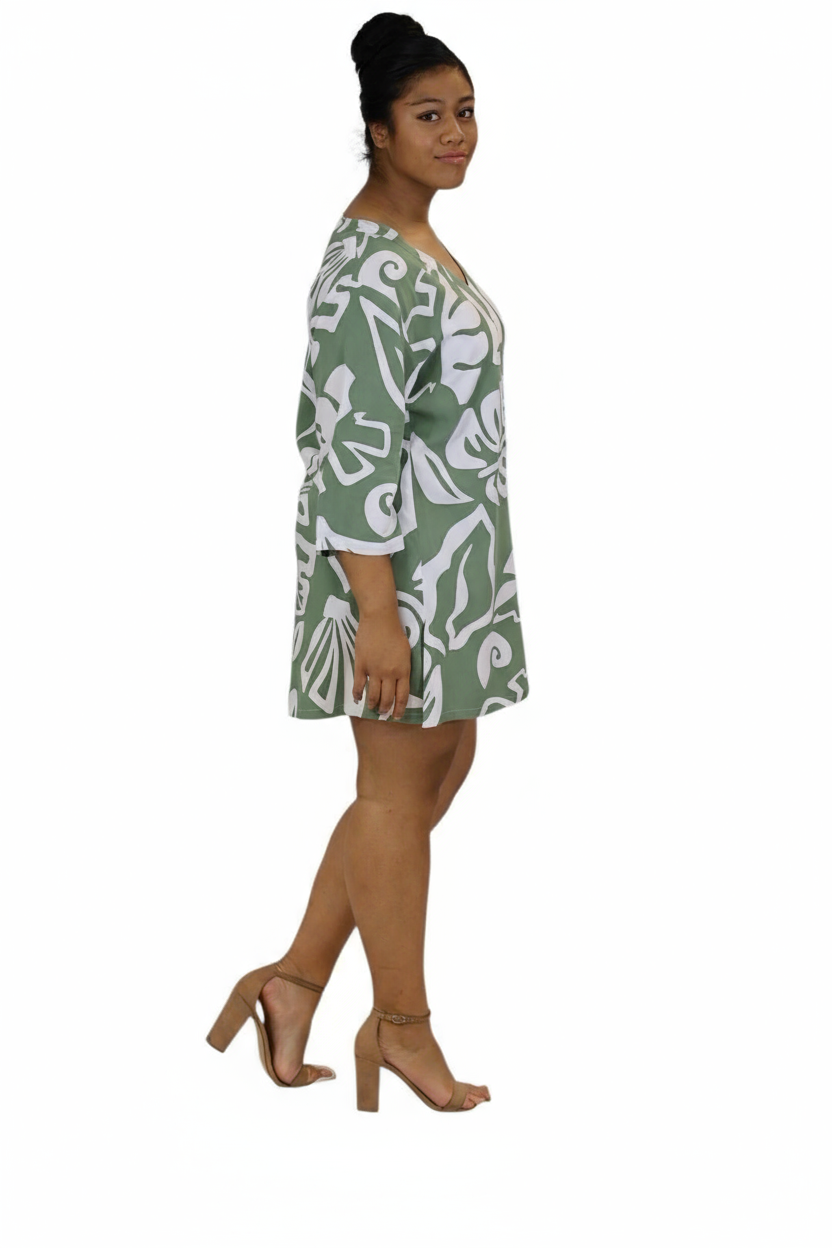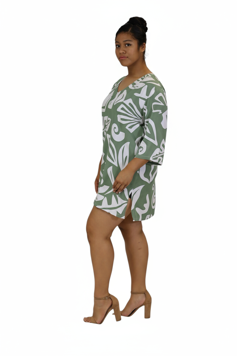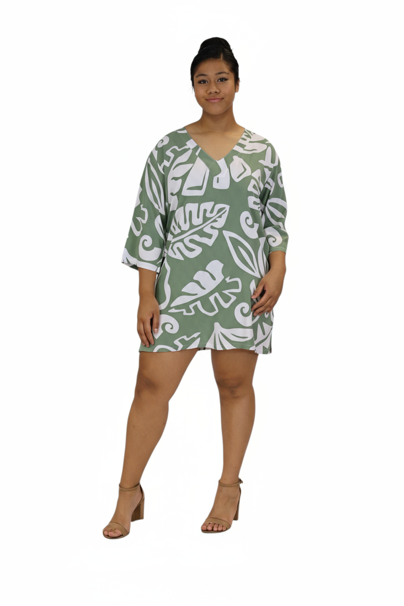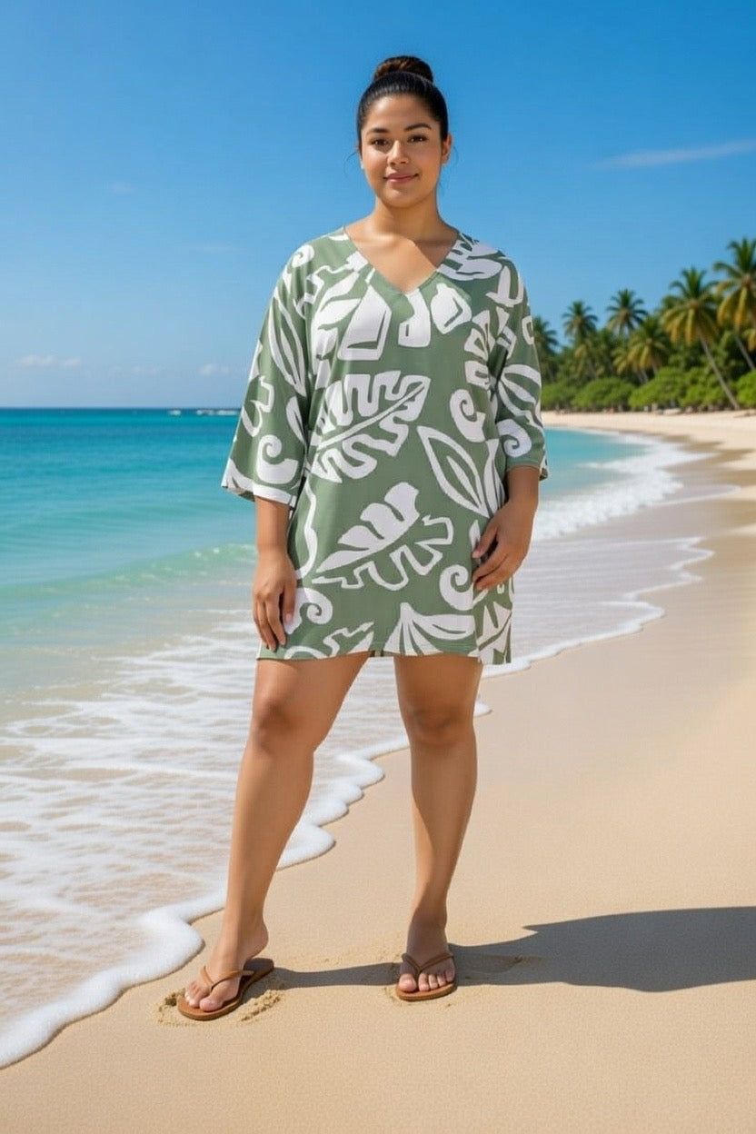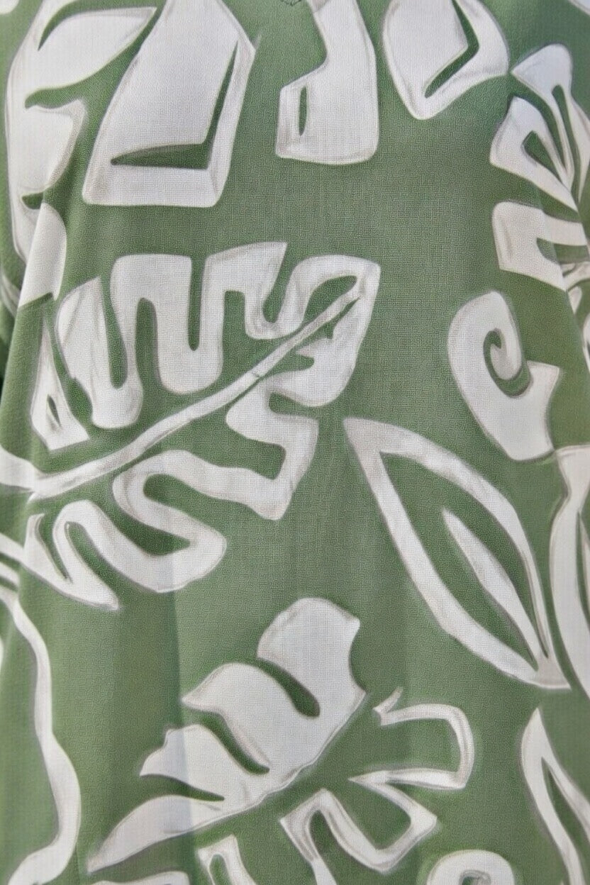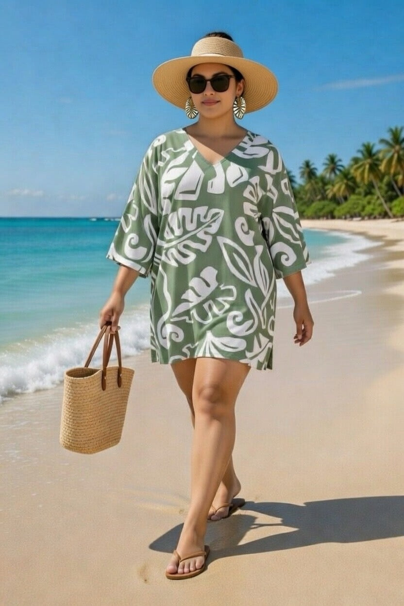 Easy, breezy, and effortlessly stylish - this V-neck kaftan top is your go-to for warm, sunny days. Made from lightweight fabric in a bold olive green print, it features 3/4 sleeves for a relaxed and flattering fit.
