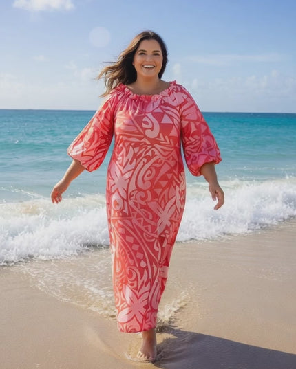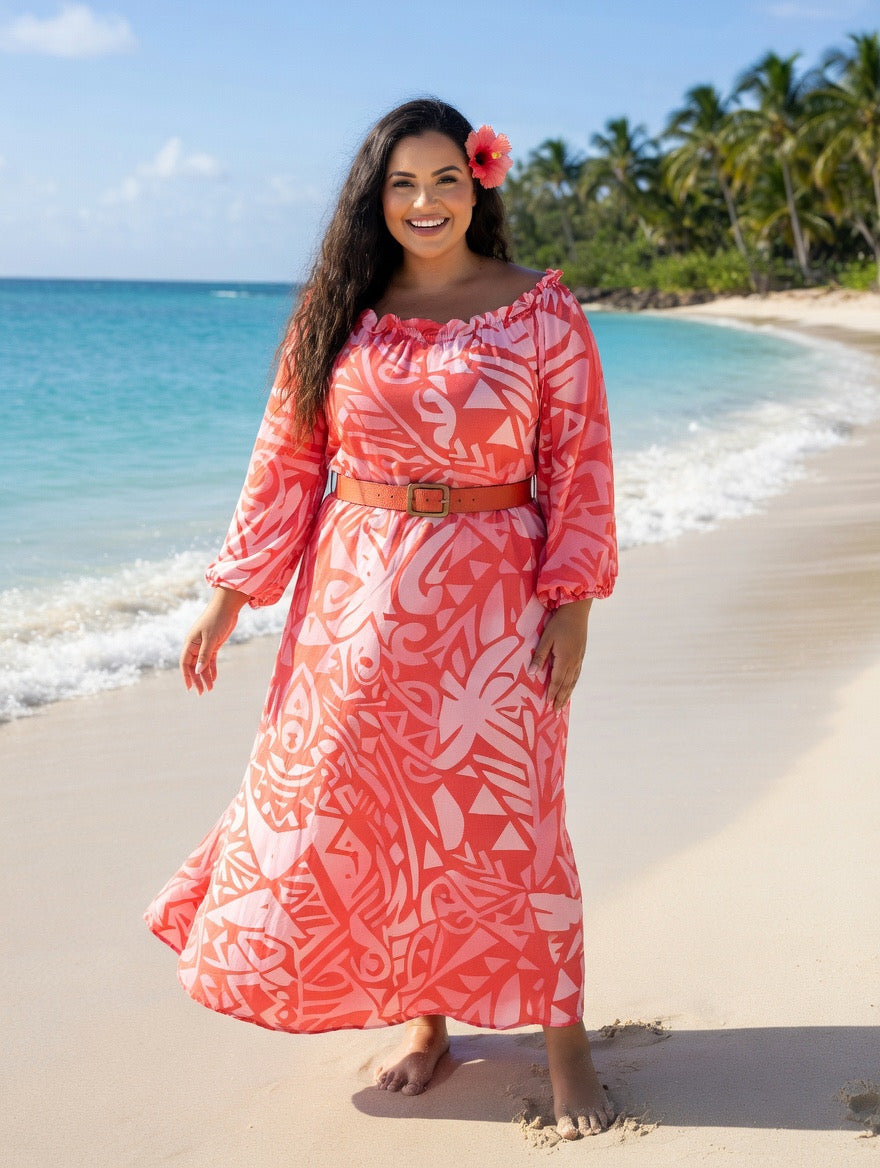 Step into island-inspired elegance with our Pink and Red tribal print chiffon maxi dress, designed for comfort, confidence, and timeless style. Featuring a bold Polynesian-inspired print in vibrant pink and red, this dress brings a fresh tropical vibe perfect for beach days vacations, and summer gatherings