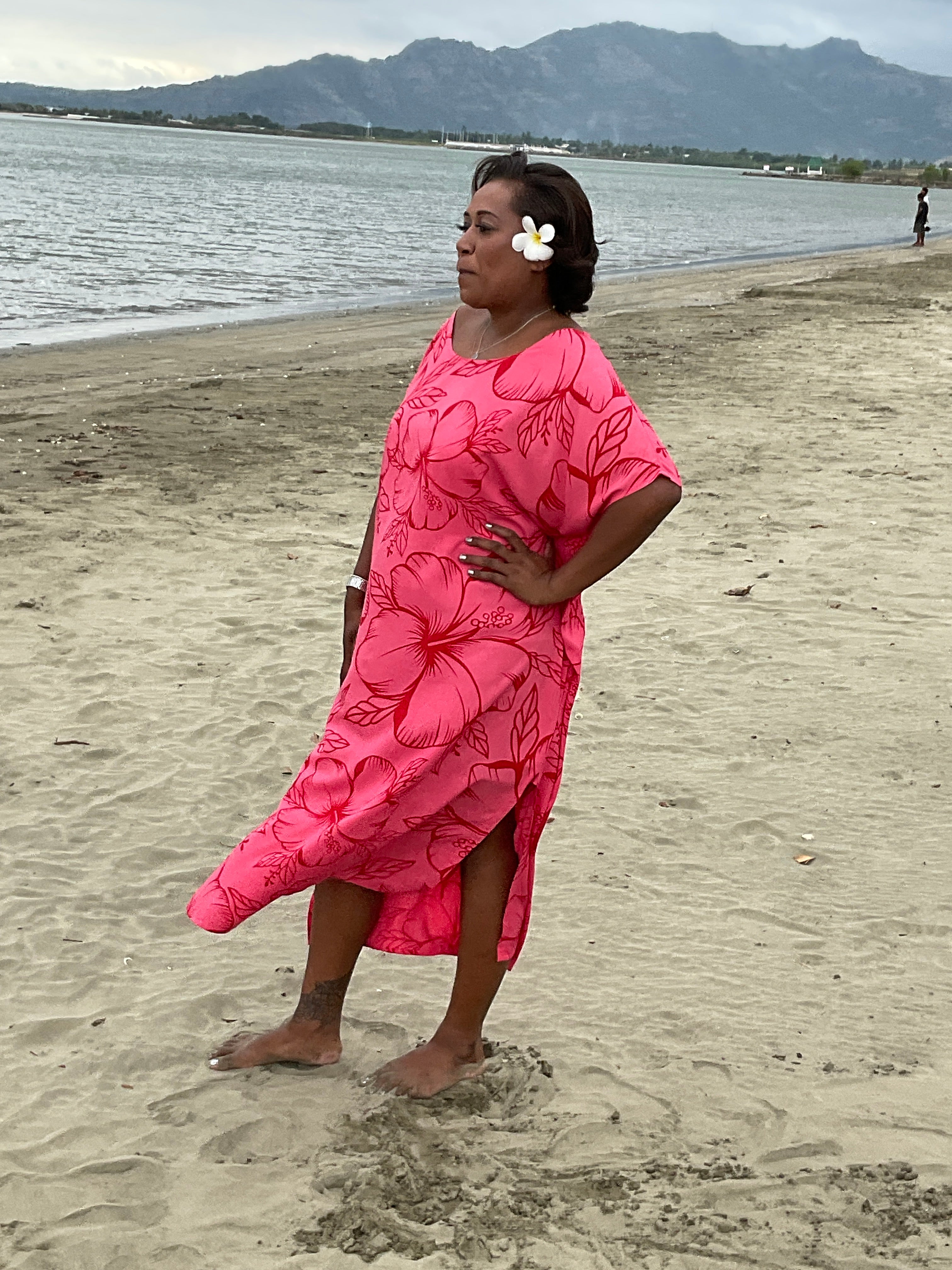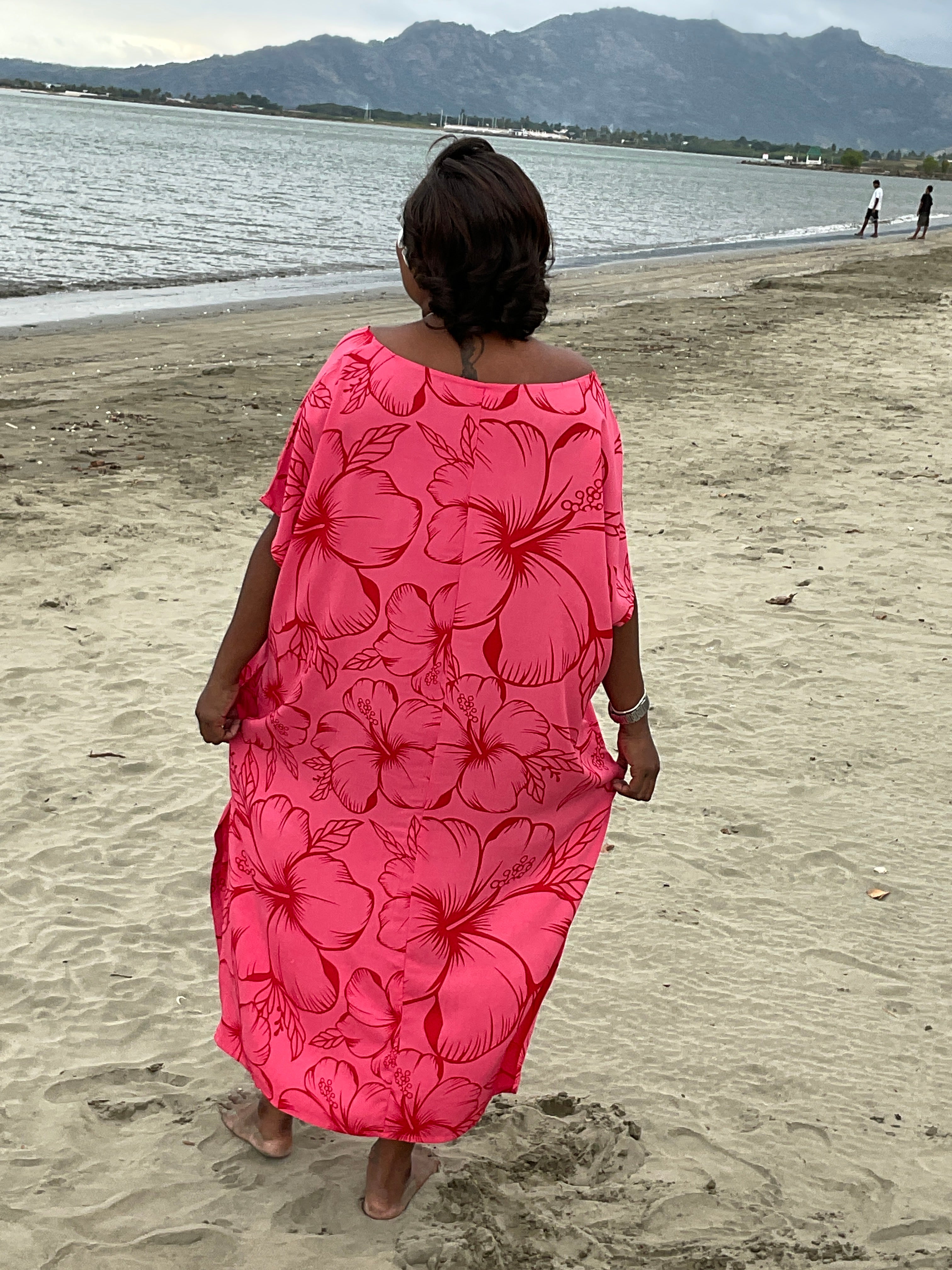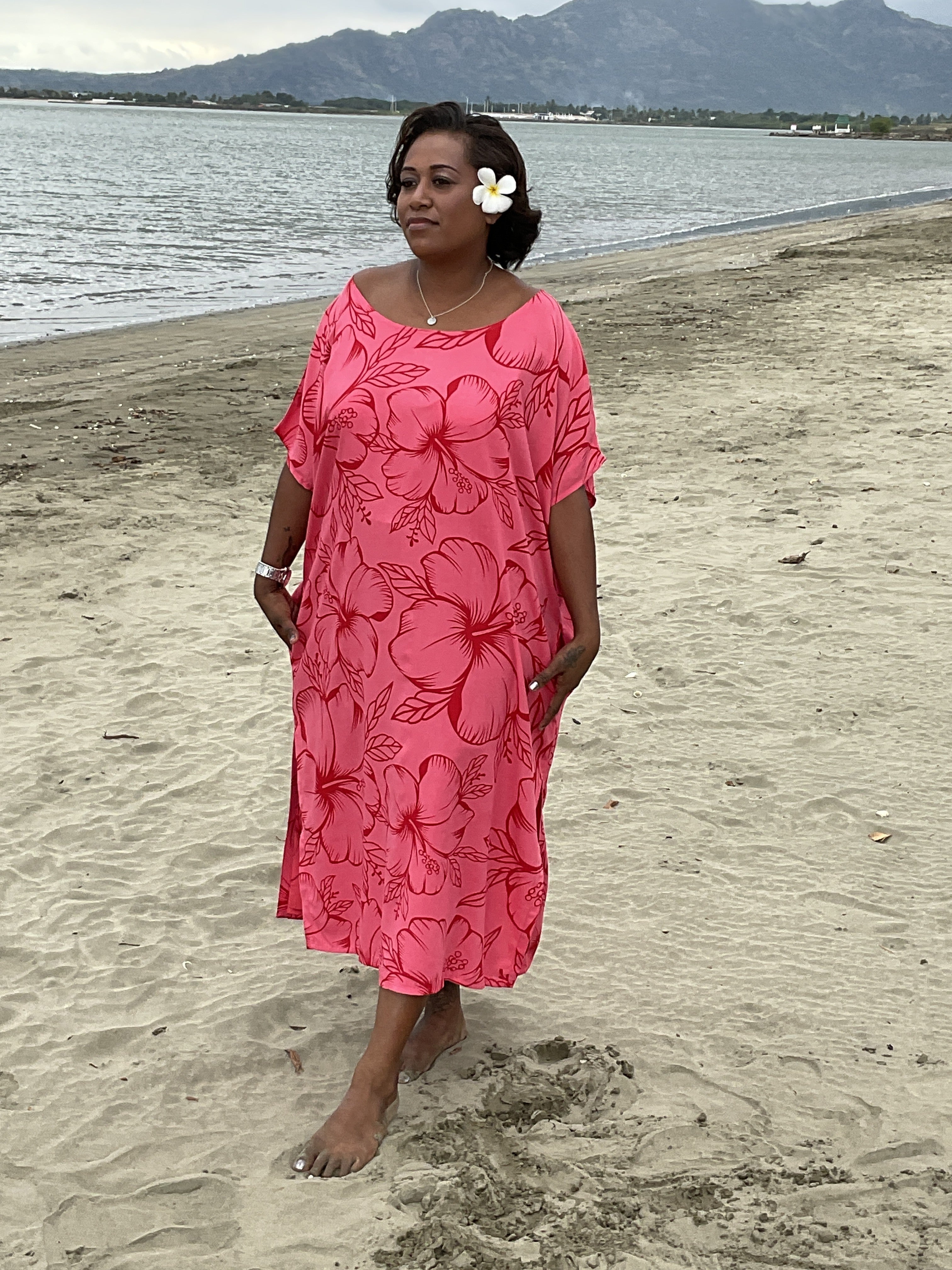 Embrace island vibes with this flowing coral dress, featuring an all-over hibiscus flower print. The loose, comfortable fit makes it perfect for a beach day or a relaxed summer outing. The vibrant color and floral design add a touch of tropical elegance to your look.