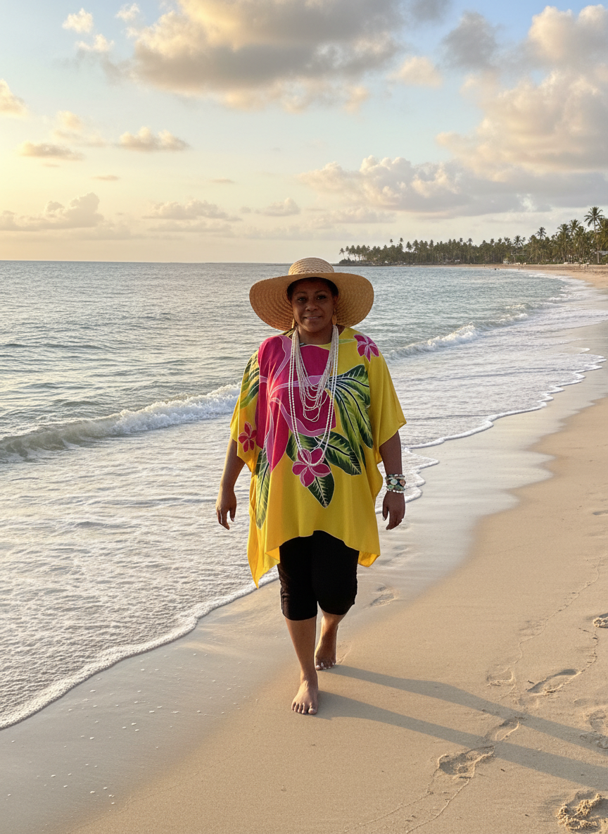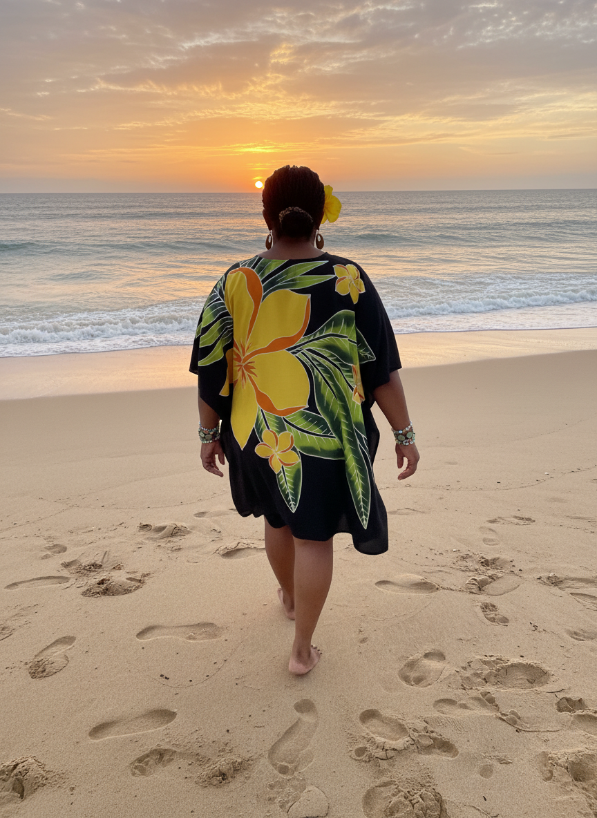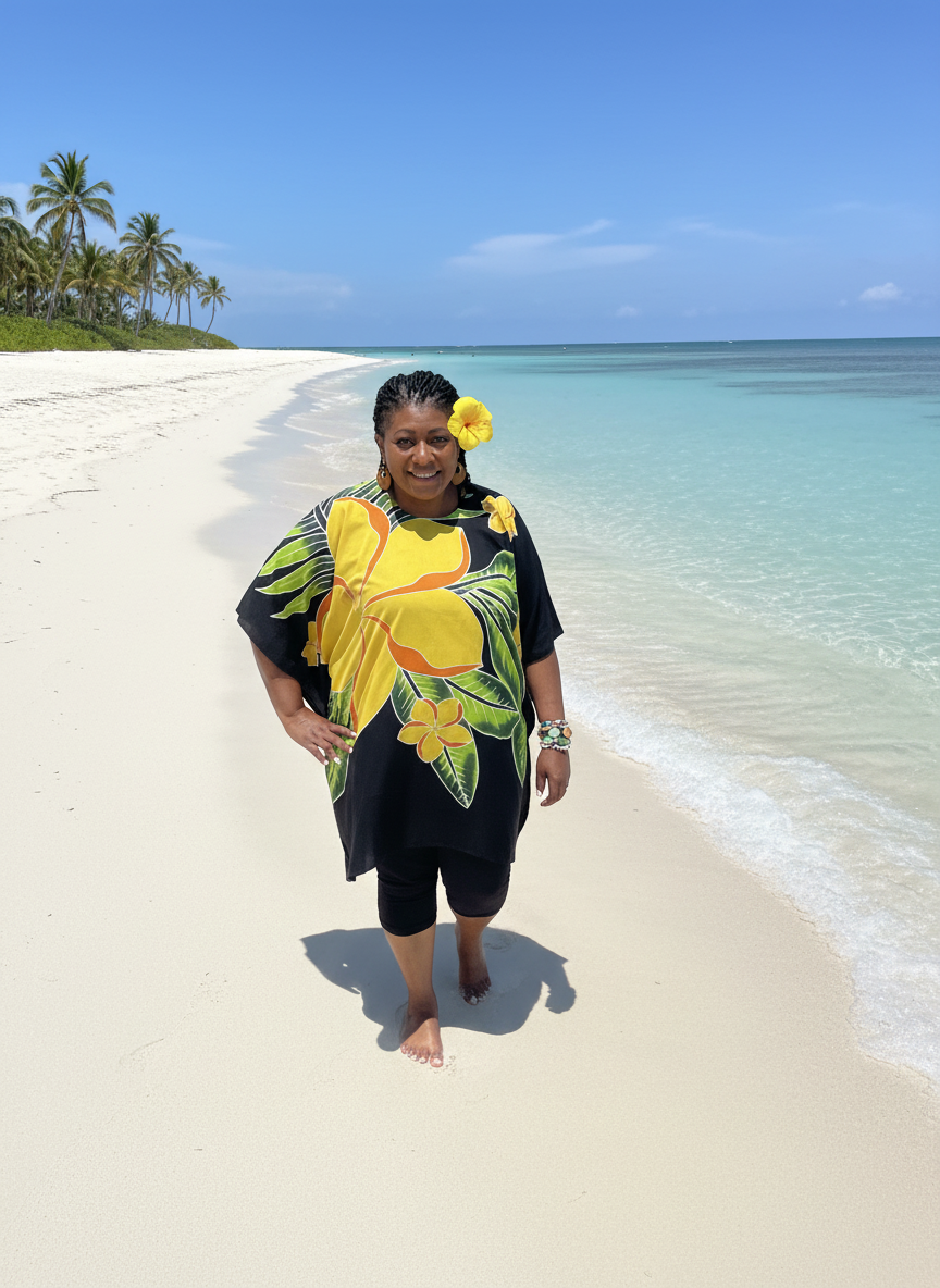 Style it with leggings, slim pants, or wear it as a statement pieces all on its own for that true  island Elegance, Global Confidence look