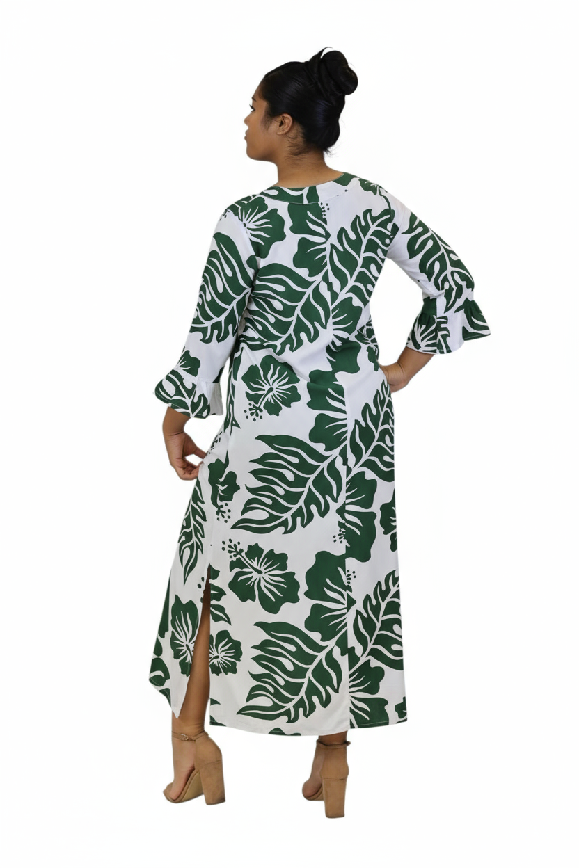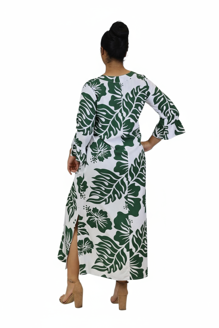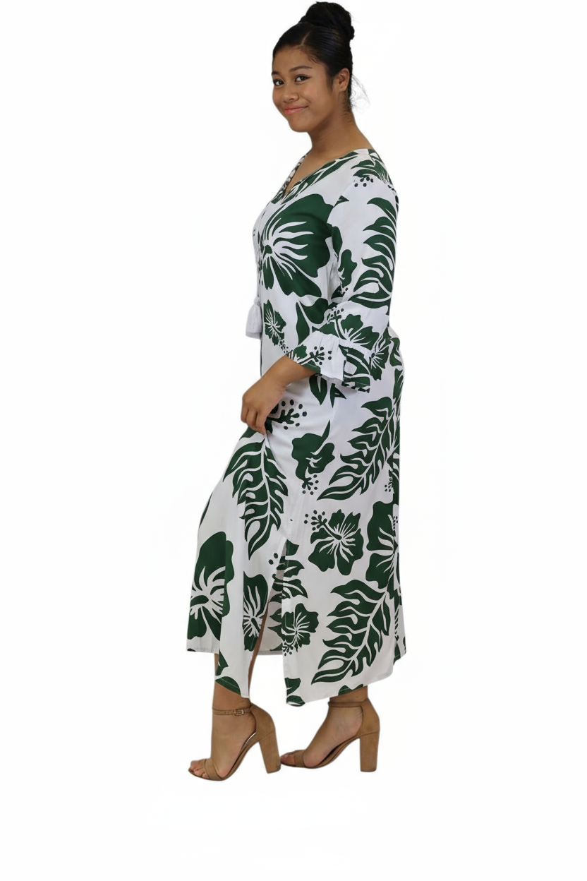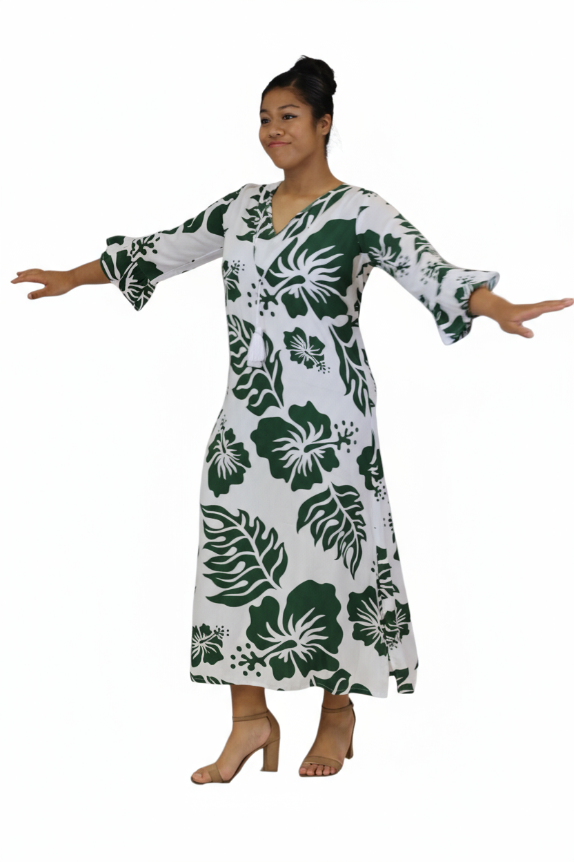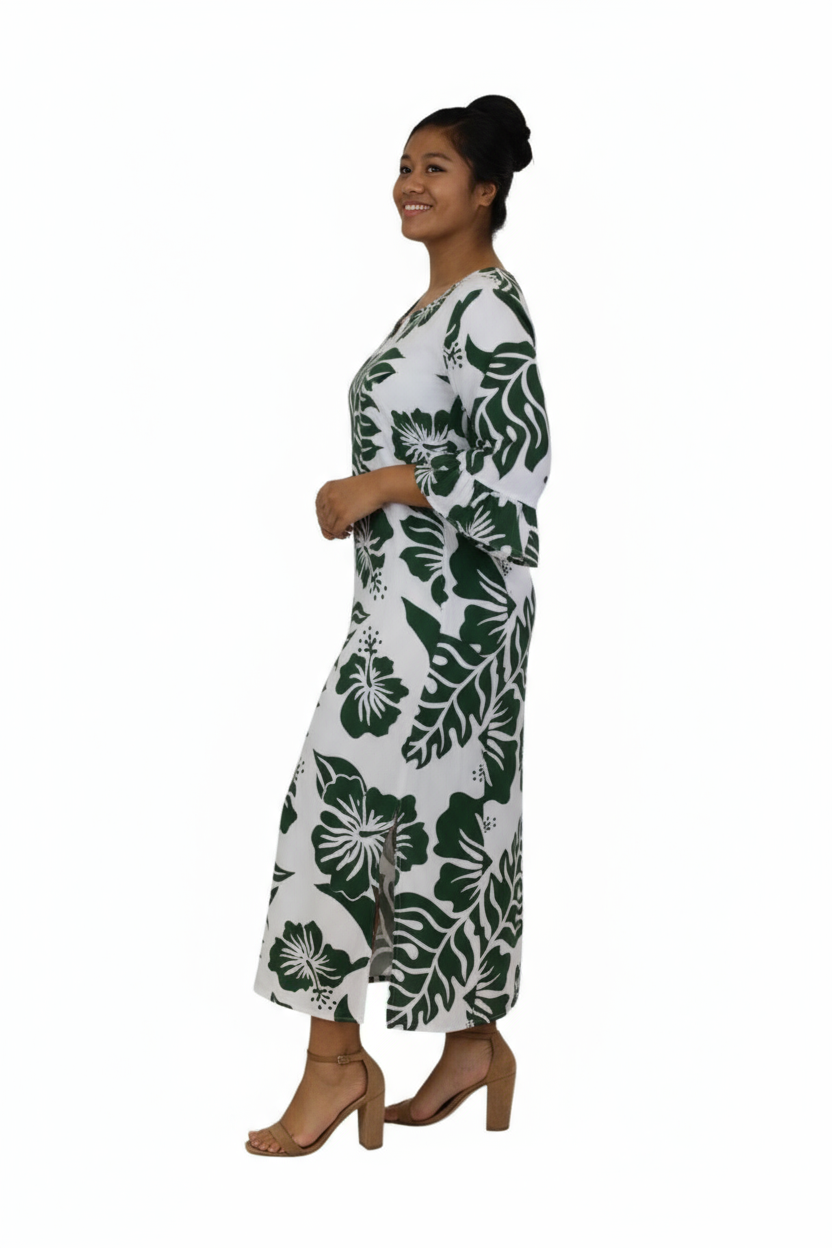 Embrace tropical elegance with this flowy rayon long dress, featuring a bold green hibiscus print on a fresh white background. Designed with a flattering V-neckline, adjustable drawstring waist, and side slits for easy movement. The 3/4 sleeves add a touch of coverage while keeping it light and breezy - perfect for island days, resort wear, or casual evenings out.