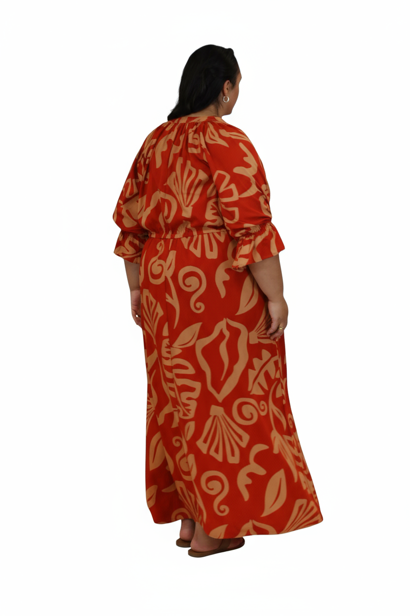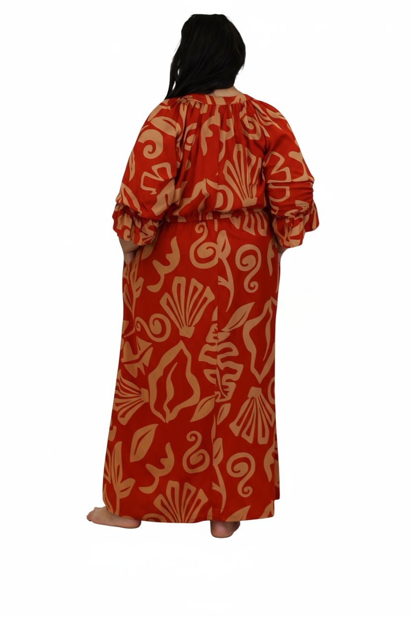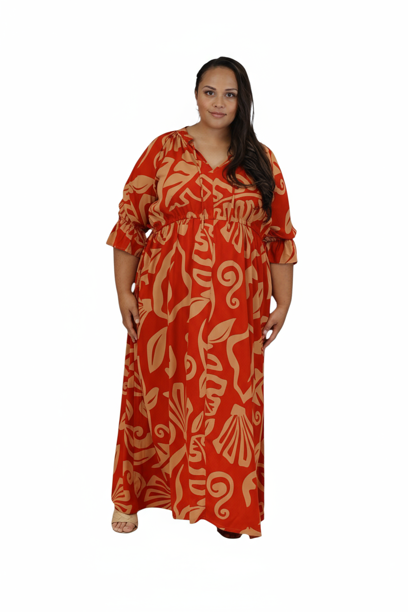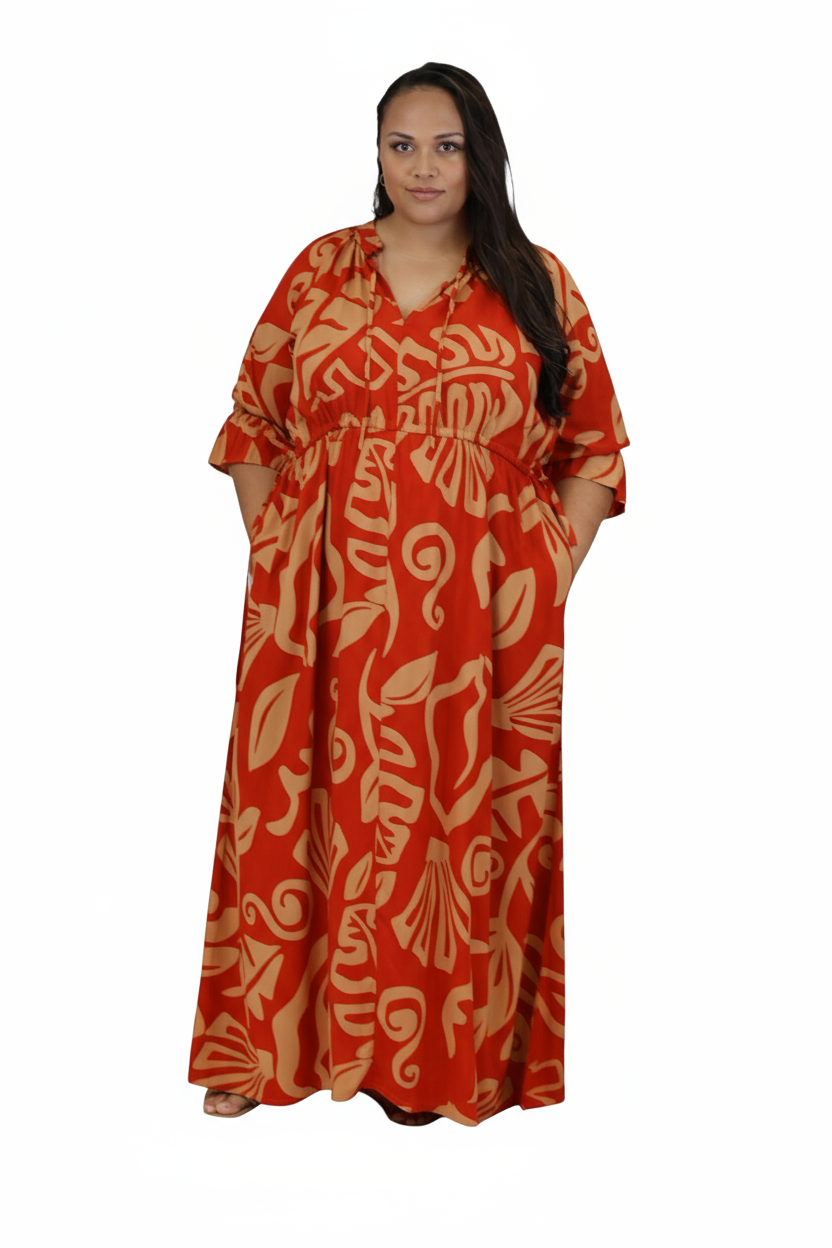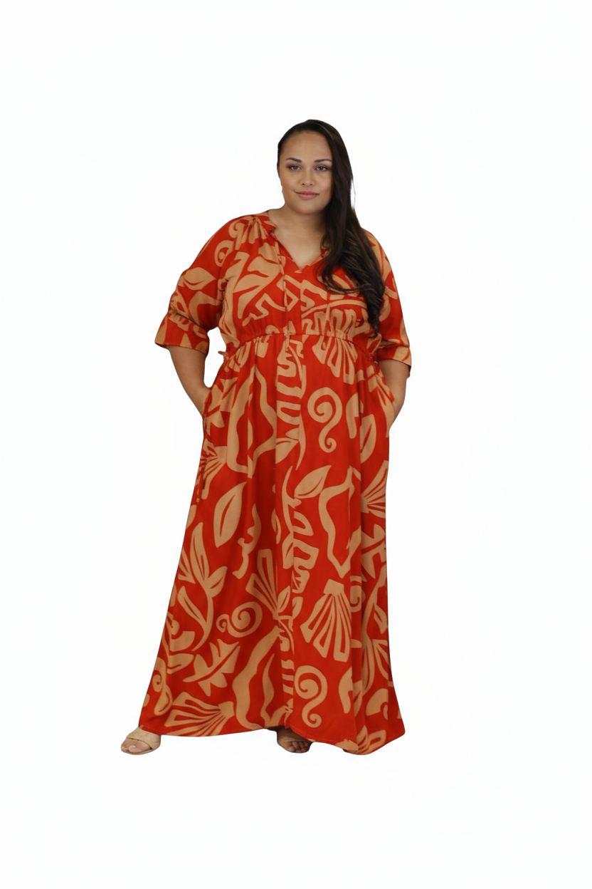Elegant and comfortable, this rayon maxi dress is designed for effortless island style. Featuring a flattering V-neckline with a drawstring adjustable waist, it allows you to customize your fit for comfort and shape. The soft, flowy rayon fabric drapes beautifully, while side pockets add a practical touch. Perfect for resort days, brunch outings, or relaxed evenings.