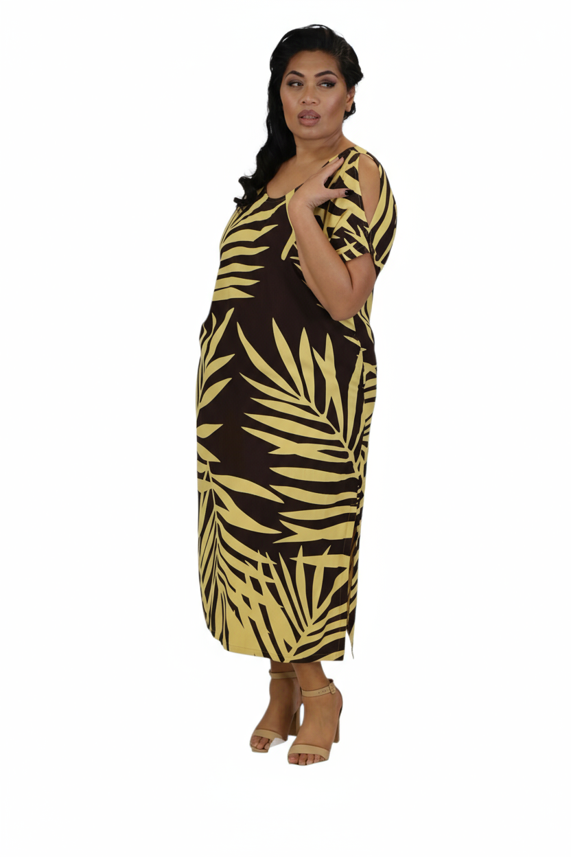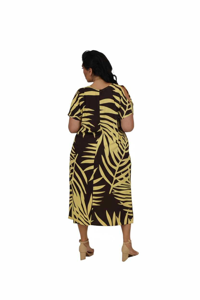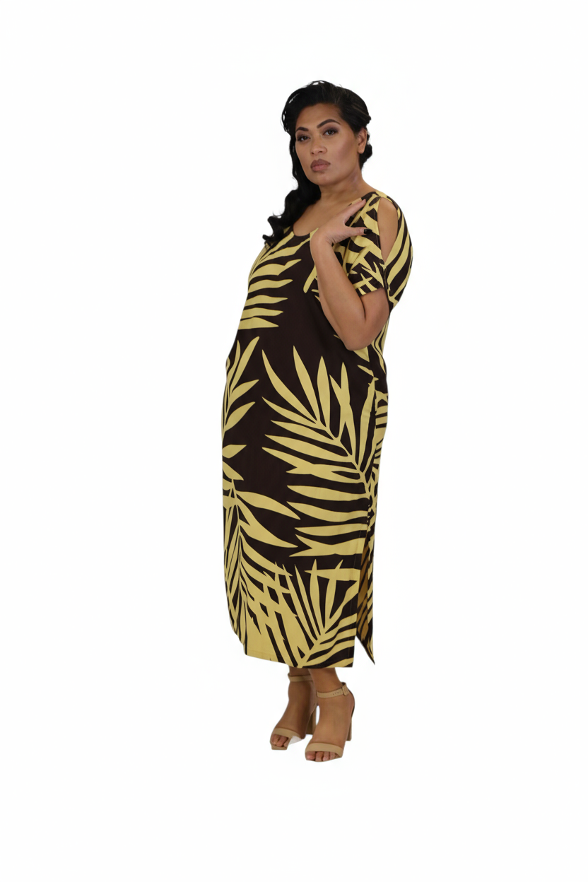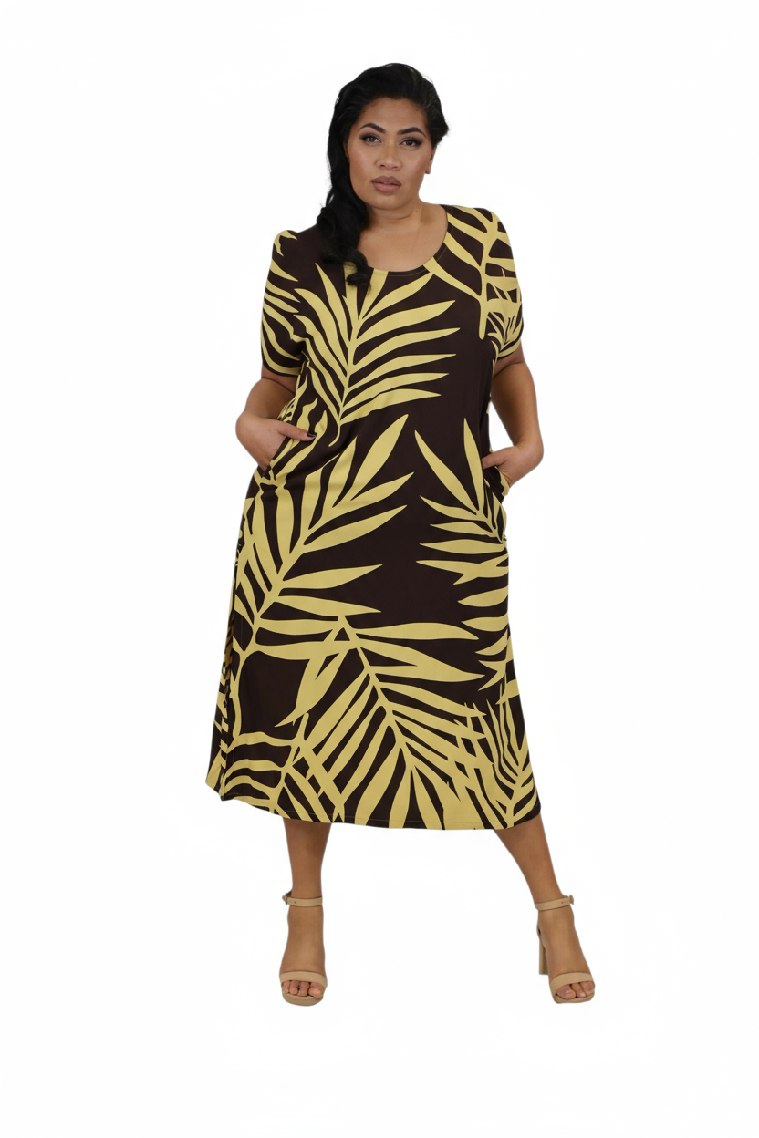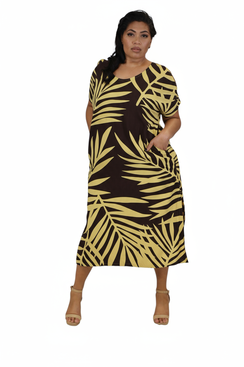 Bring effortless island elegance to your everyday style with this stunning rayon maxi dress. Featuring a bold yellow fern print on a deep dark brown background, this dress captures tropical warmth with a modern twist. Designed with a relaxed straight fit, round neckline, and short sleeves for all-day comfort. Hidden side pockets add a practical touch while maintaining a sleek silhouette.