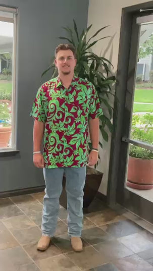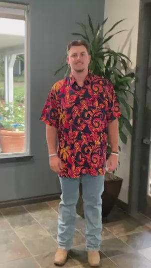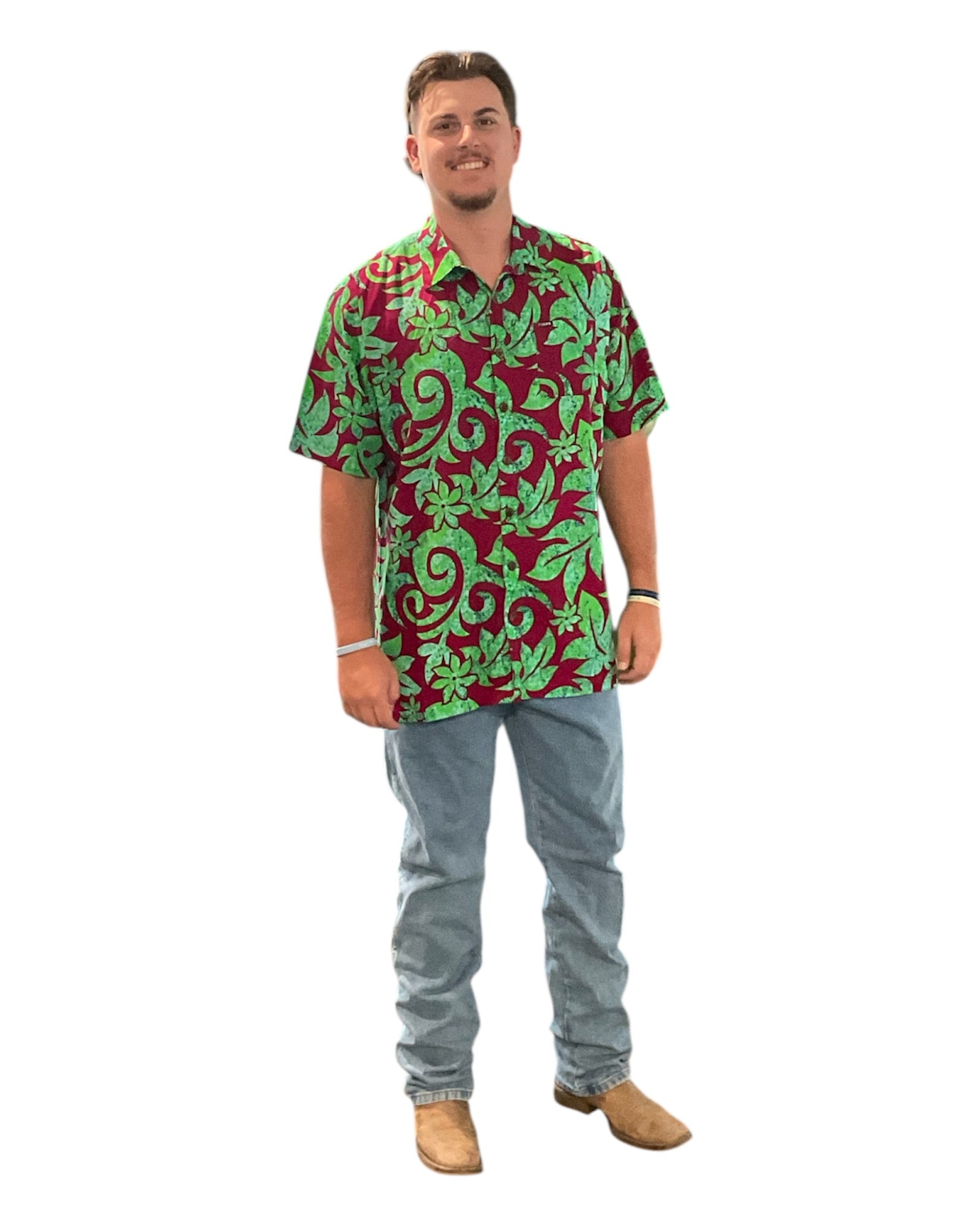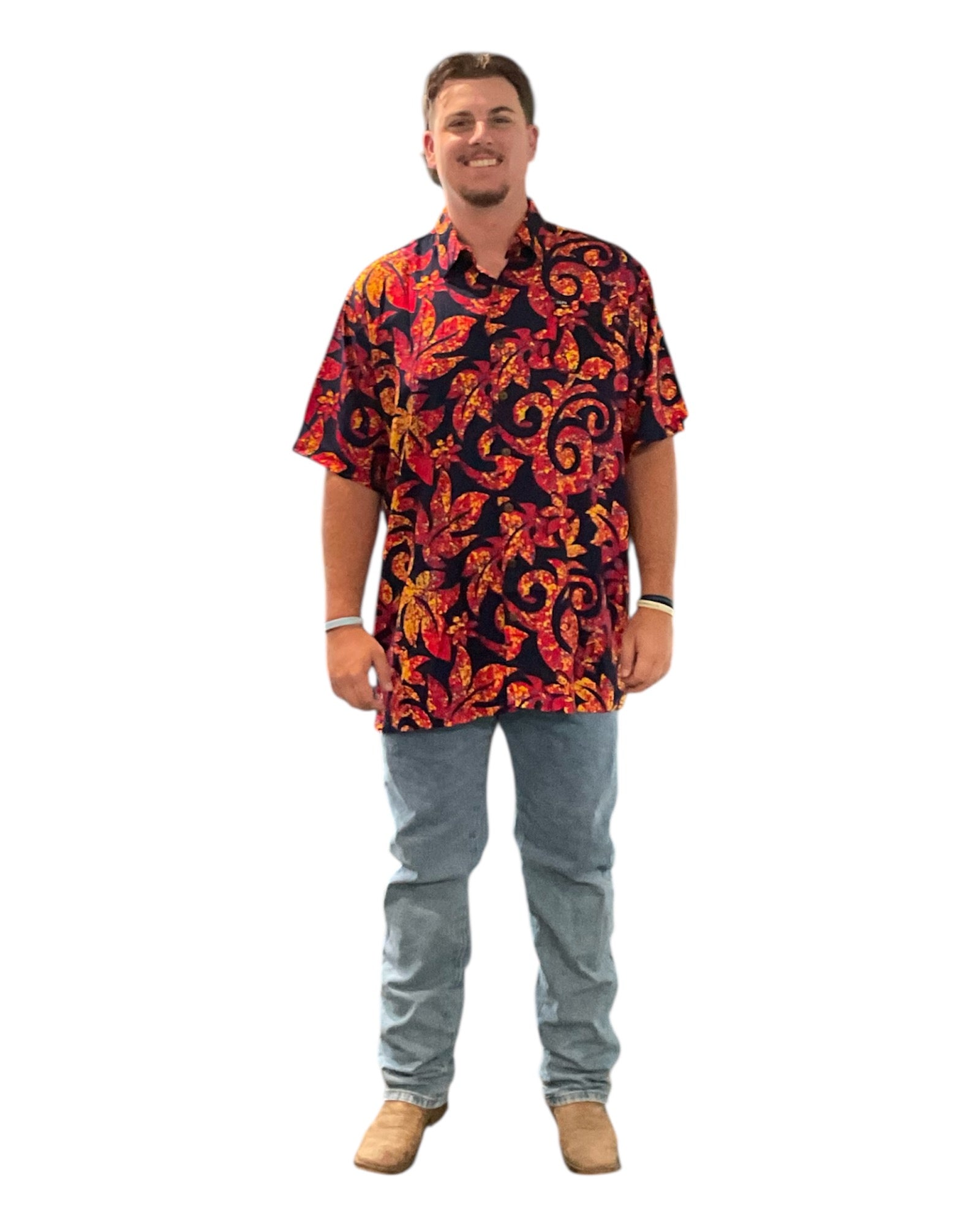 Stand out in effortless island style with this vibrant rayon men's shirt. Featuring a striking red, blue and green leaf pattern against a deep background, its designed for both comfort and confidence. The light weight rayon fabric offers a breathable, soft feel with a relaxed drape that's perfect for warm days, casual outings, or resort evenings.