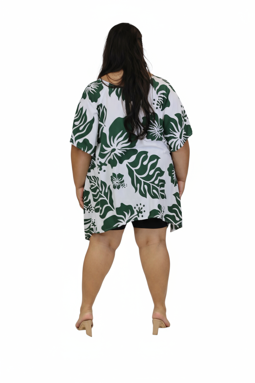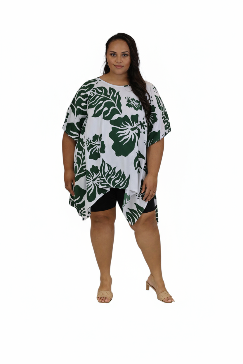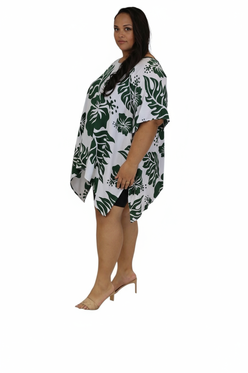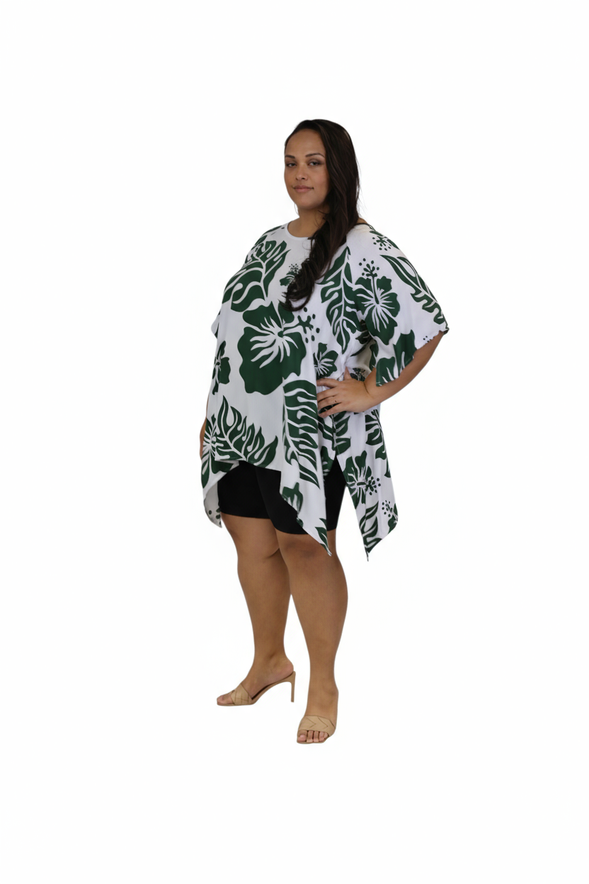 Stay cool and stylish in this lightweight rayon poncho top featuring a bold green hibiscus print on crisp white. Designed with a round neckline, relaxed bell sleeves, and flattering side slits, this oversized on-size piece offers effortless comfort and flow. Perfect for layering over shorts, leggings, or swimwear for an easy island-inspired look.