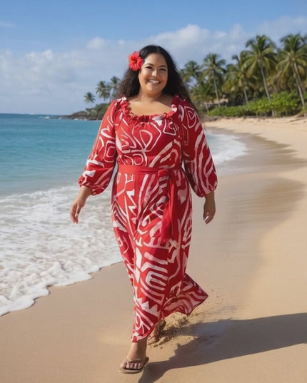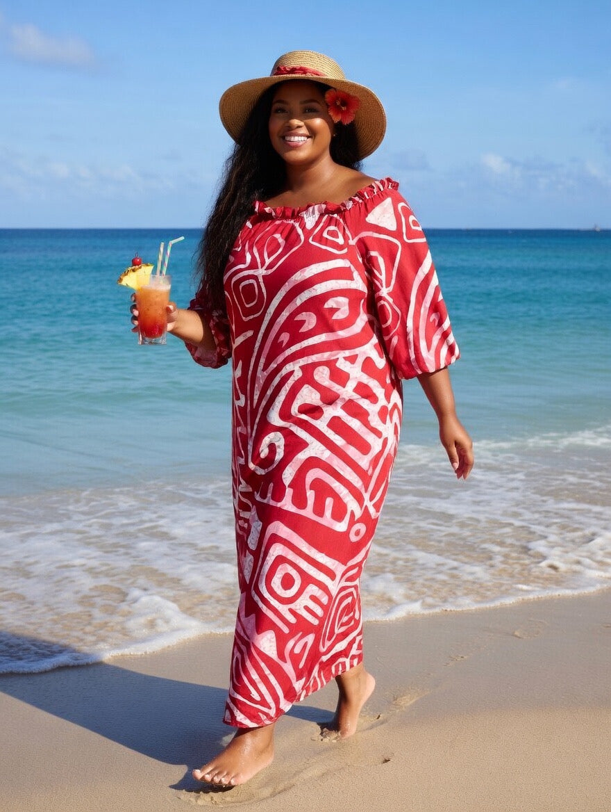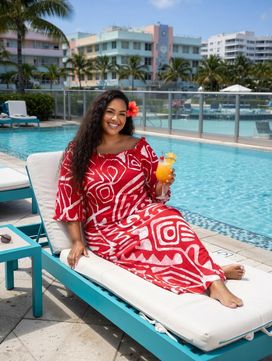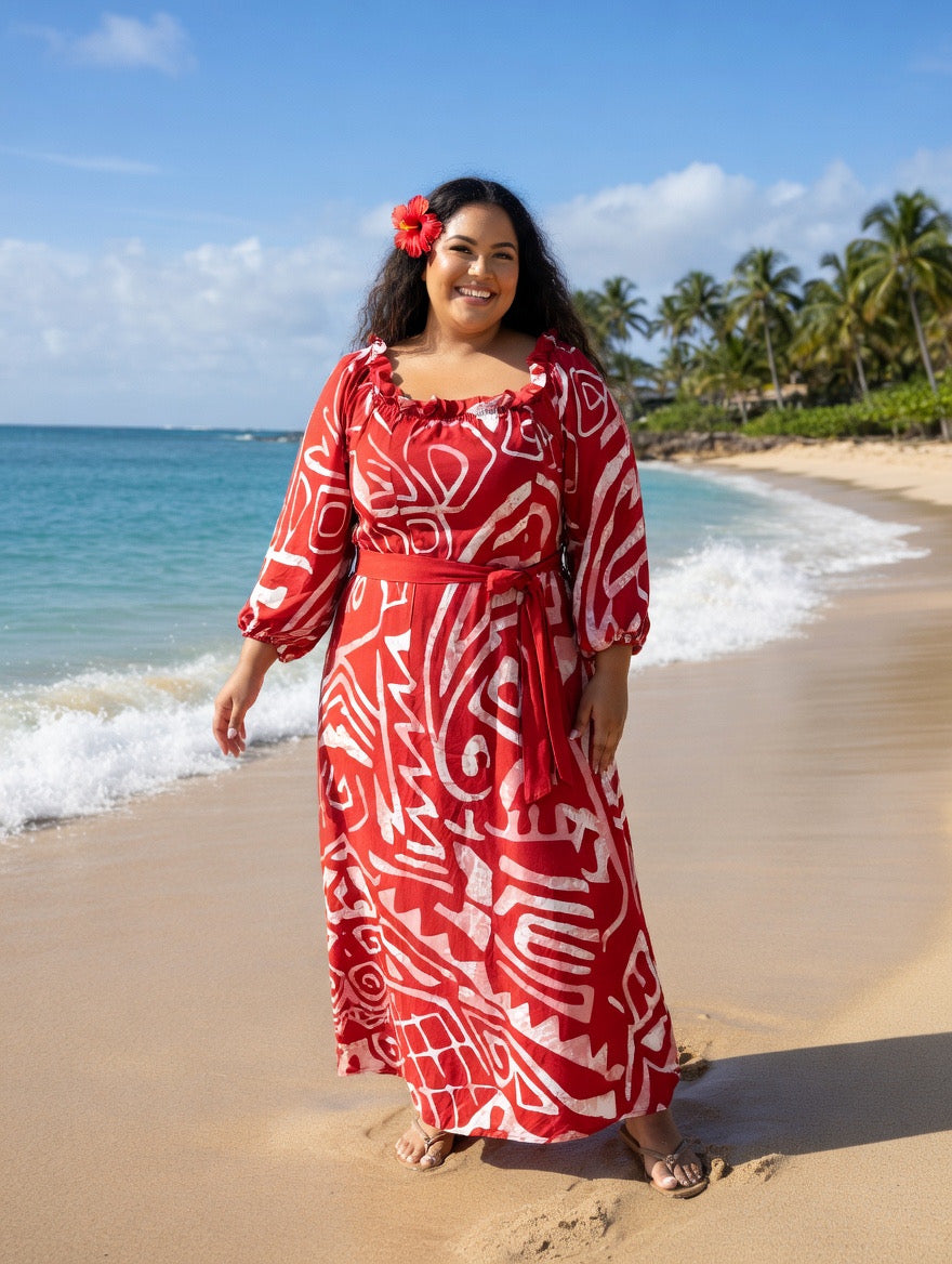 Step into Island-inspired elegance with our Red and White Tribal Print Chiffon Maxi Dress, designed for comfort, confidence, and timeless style. Featuring a bold Polynesian-inspired print in vibrant red and white, this dress brings a fresh tropical vibe perfect for beach days, vacations, and summer gatherings.