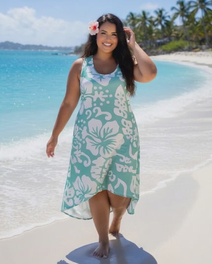 Step into effortless island elegance with this mint hibiscus print sleeveless high-low dress, designed for comfort, movement, and timeless tropical style. Made from lightweight, breathable fabric, this dress keeps you cool and comfortable, making it perfect for warm weather, beach days, and resort getaways.