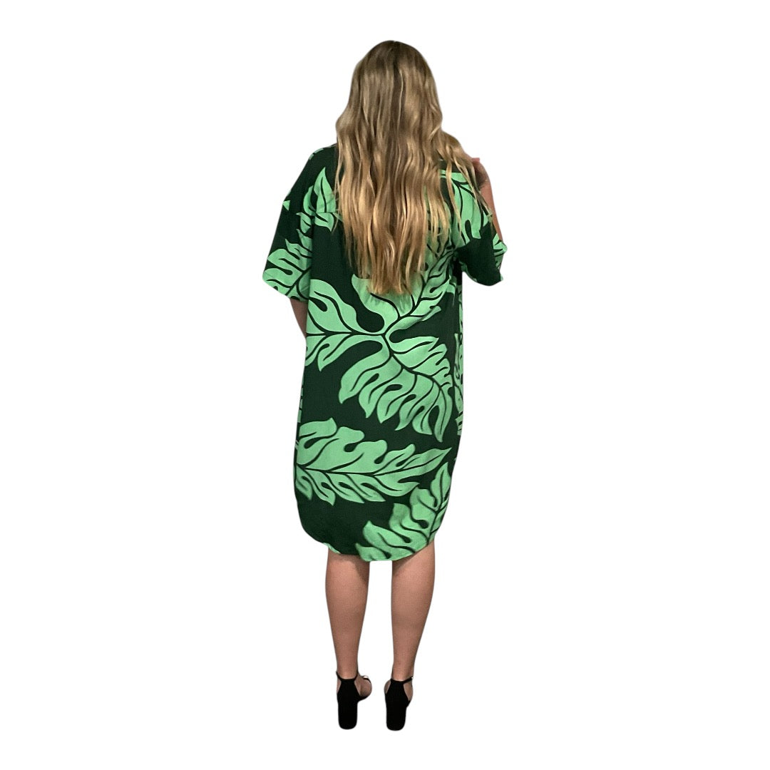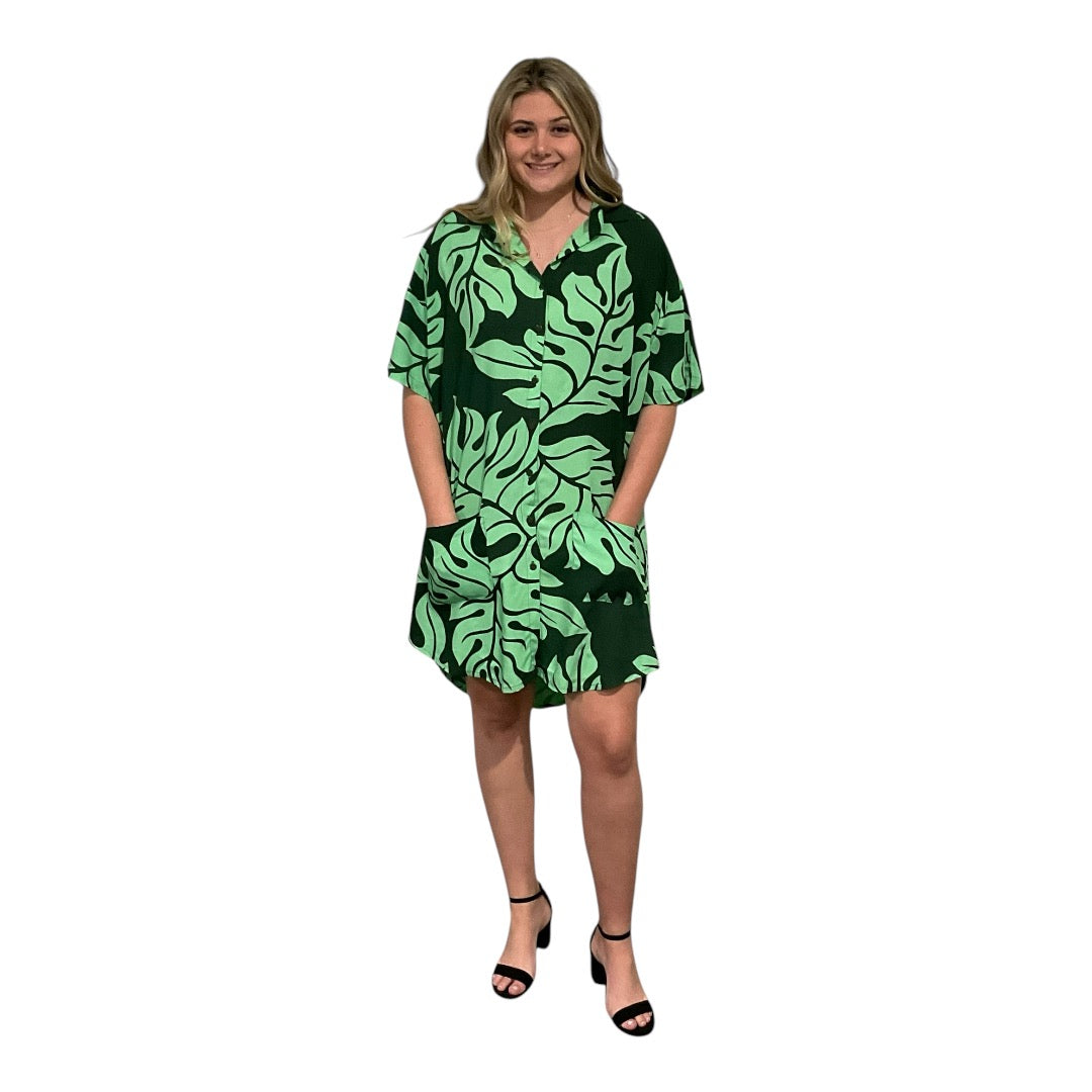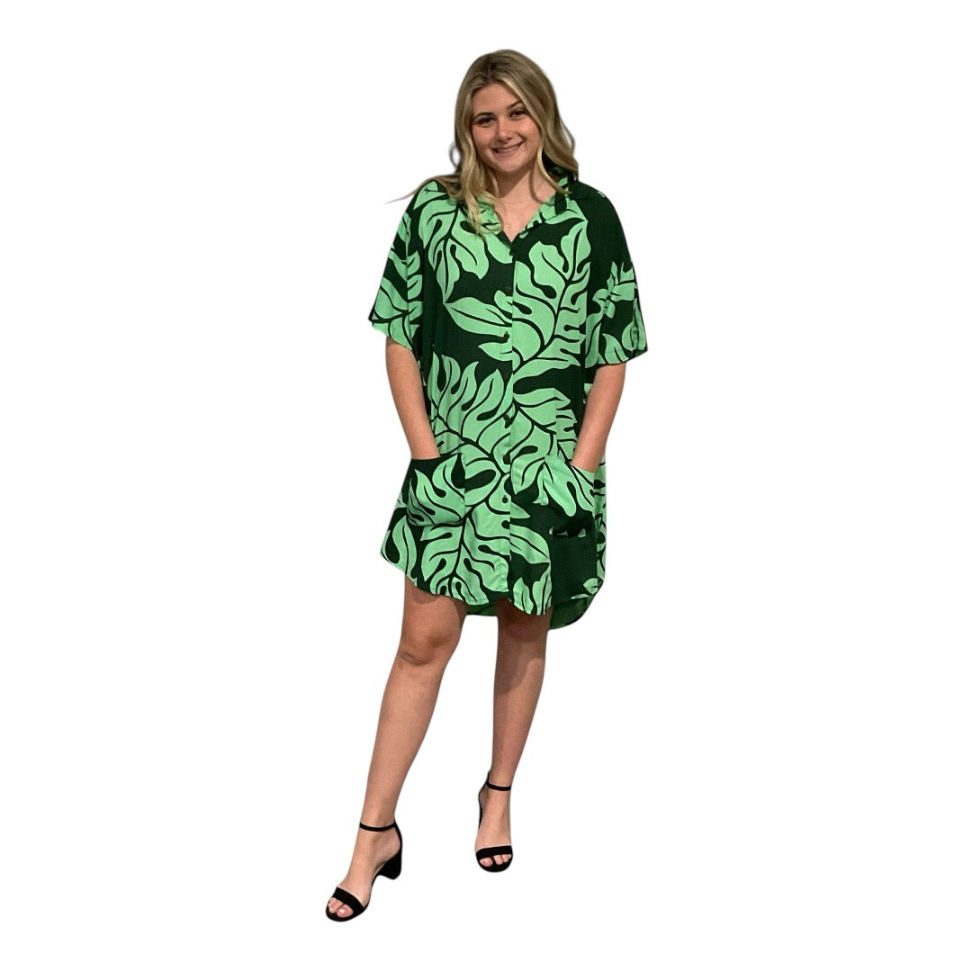 WOMEN'S SHIRT DRESS DETAILS Monstera print Buttons down front Collar Sides pockets MATERIAL AND CARE Rayon material Machine cold wash... Read more