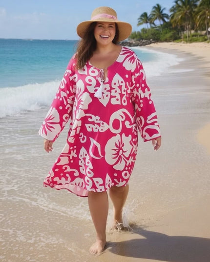 Featuring a relaxed, flowy silhouette with a flattering v-neckline drawstring, this kaftan offers both comfort and style. The stunning pink hibiscus print brings a chic island vibe, perfect for beach days, resort lounging or casual summer outings
