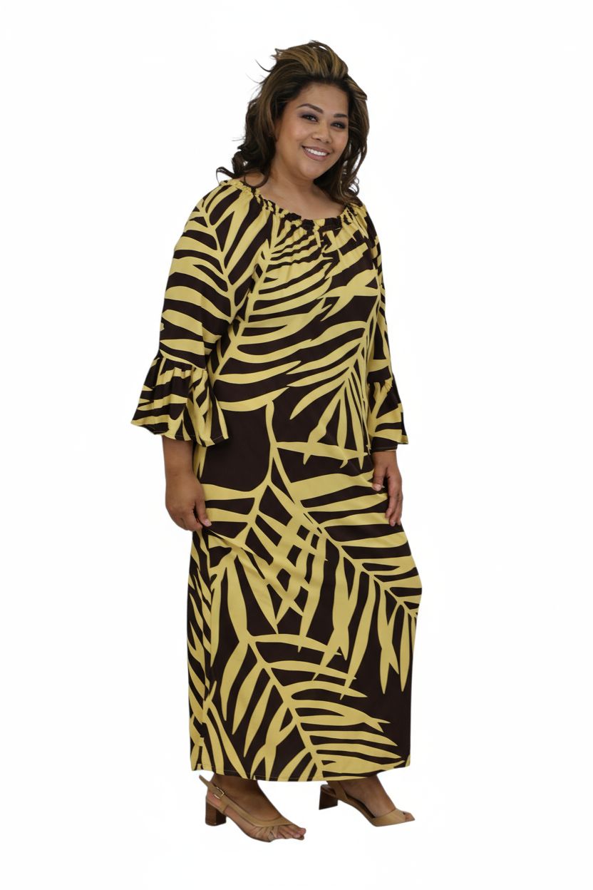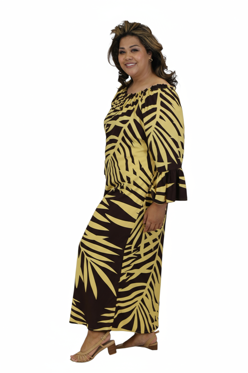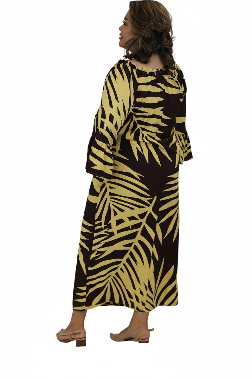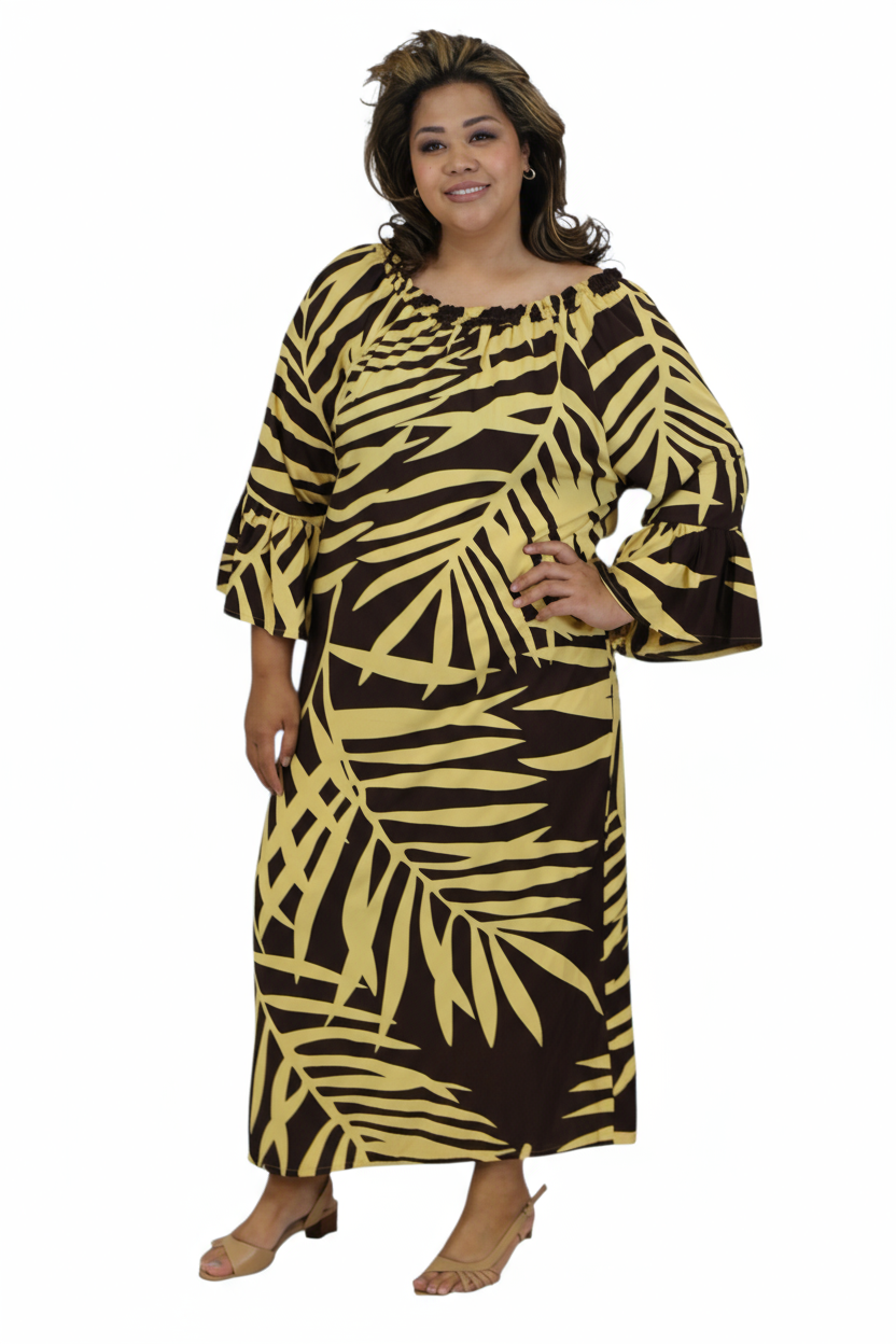 Step into effortless island elegance with this stunning fern-print maxi dress. Crafted from soft, breathable rayon it features a floor-length straight silhouette that flows beautifully with every step. The elastic neckline offers versatile styling-wear it on or off the shoulder-while the long sleeves add a graceful, relaxed touch.